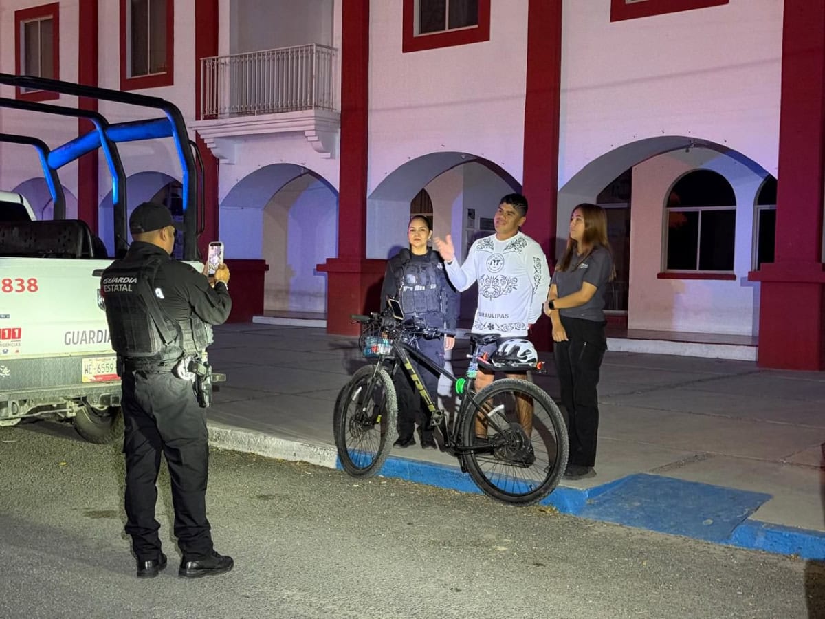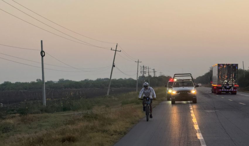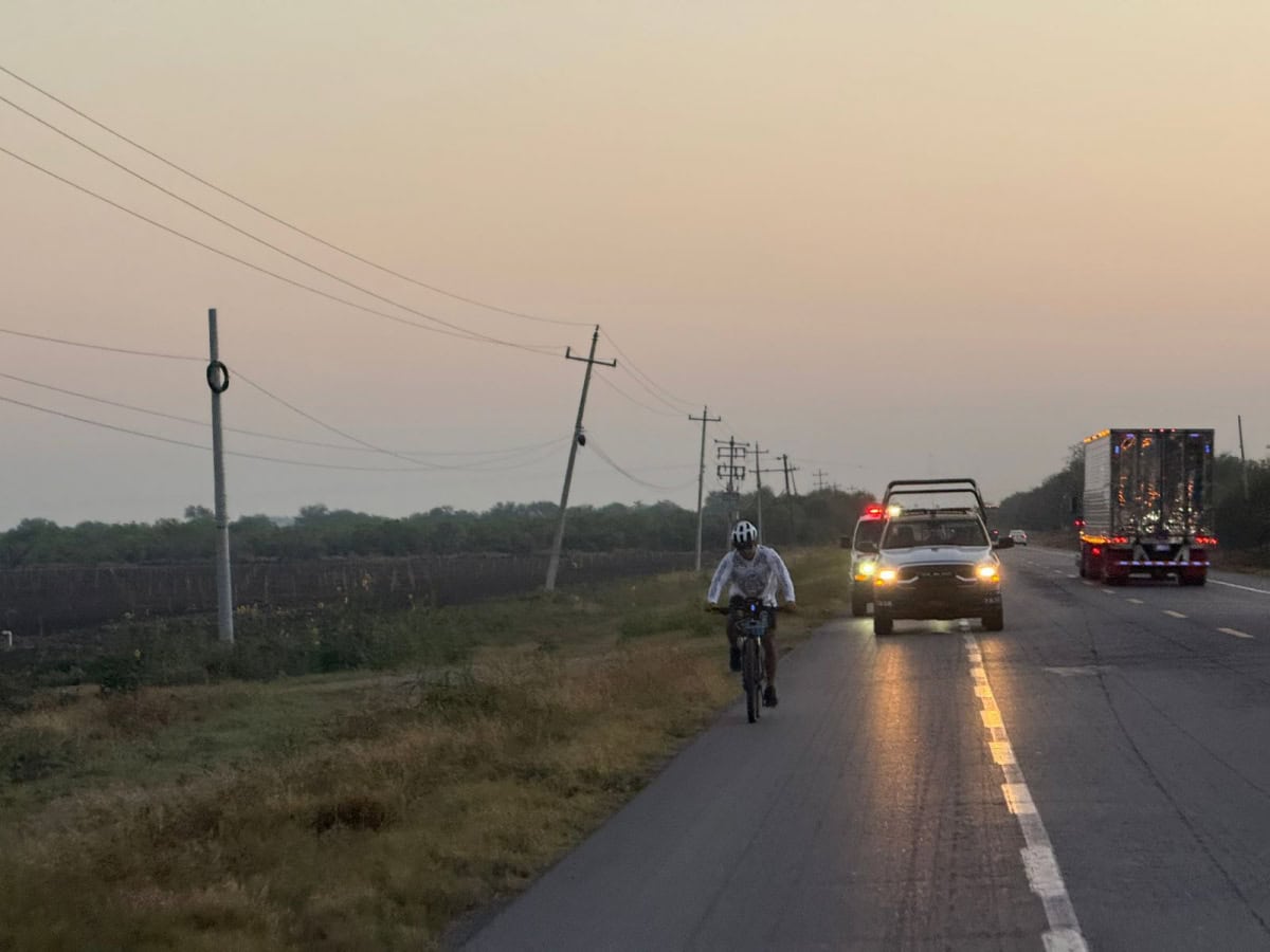 Güémez, Tamaulipas.- Personal de la Guardia Estatal brinda seguridad y acompañamiento al atleta tamaulipeco César Omar Vallejo Ledezma, quien continúa su recorrido por el estado con el proyecto “Rodando por Tamaulipas”.