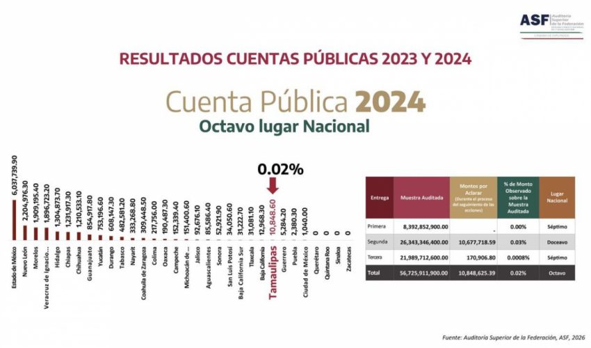 Ciudad Victoria, Tamaulipas.- En el marco del Cuarto Informe de Gobierno, el gobernador Américo Villarreal Anaya destacó la fiscalización de la Cuenta Pública 2024 realizada por la Auditoría Superior de la Federación (ASF), donde se reportó un monto por aclarar de apenas el 0.02% del total fiscalizado, ubicando a Tamaulipas como uno de los estados que mejor desempeño tienen en la materia.