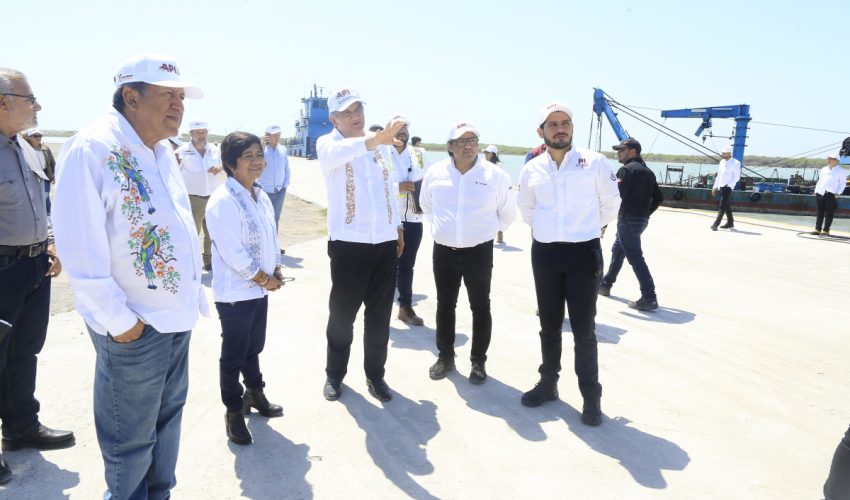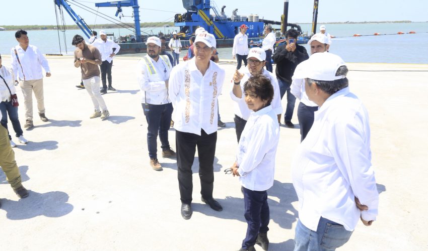 En la zona del muelle, supervisaron los trabajos que realiza la draga Montebello ADR-18, la cual cuenta con un tubo de 2 kilómetros de extensión, de 24 pulgadas de diámetro, con una capacidad de bombeo de 7 mil metros cúbicos por turno.