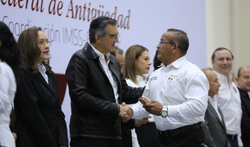 Acompañado por Marggid Rodríguez Avendaño, coordinador de IMSS-Bienestar en Tamaulipas y dirigentes sindicales, el jefe del Ejecutivo entregó 37 premios de antigüedad, de un total de 1,400 a personal de salud, destacando por 60 años de servicio, Almarcelia Cárdenas Guardado, enfermera general titulada «B», del Distrito de Salud para el Bienestar I, en Ciudad Victoria.
