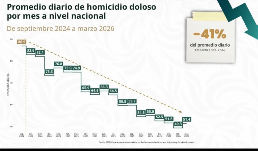 En México, los homicidios dolosos disminuyeron 41 por ciento al pasar de un promedio diario de 86.9 en septiembre de 2024 a 51.4 en marzo de 2026.