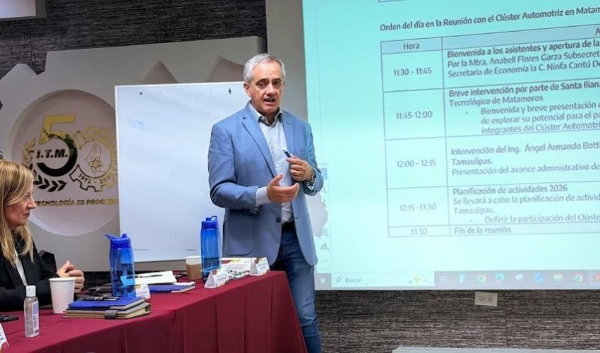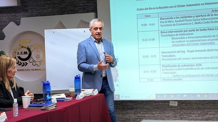 Matamoros, Tamaulipas.– Con el objetivo de fortalecer la planeación estratégica y atender las necesidades del sector industrial, académico y gubernamental, la Universidad Tecnológica de Matamoros (UTM) participó en una reunión de seguimiento del Clúster Automotriz de Tamaulipas.