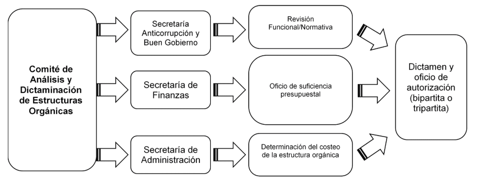 La Secretaría Anticorrupción y Buen Gobierno del Estado de Tamaulipas impulsa la dictaminación de estructuras orgánicas de las Dependencias y Entidades de la Administración Pública Estatal, con la finalidad de garantizar que las estructuras organizacionales de cada ente definan la distribución de responsabilidades, autoridad y flujos de trabajo para alcanzar sus objetivos de manera eficaz y eficiente.