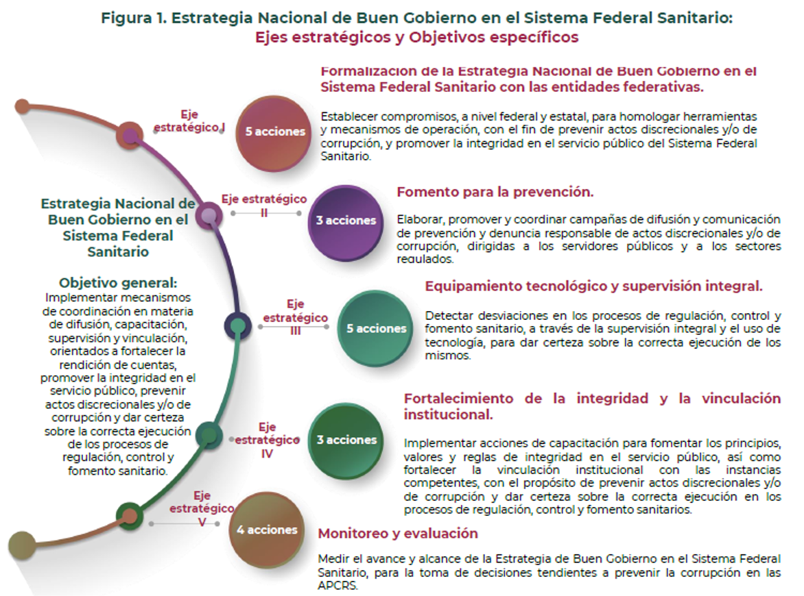 Por lo que refiere en el ámbito federal, en el contexto del Código de Conducta de la Comisión Federal para la Protección contra Riesgos Sanitarios, el cual tiene por objetivo el establecer principios, valores, reglas de integridad, conductas y compromisos, que deberán ser observados, promovidos y respetados por todo el personal de la COFEPRIS, con la finalidad de que la Institución se distinga por el cumplimiento de los estándares éticos y de desempeño profesional en la protección contra riesgos sanitarios; y en concordancia con el marco normativo y el marco conceptual de la corrupción, la presente estrategia busca fortalecer la prevención de posibles actos de corrupción en las APCRS, a través de la implementación de 5 Ejes estratégicos que tienen como propósito cumplir la ejecución de 20 actividades específicas, que, a su vez, coadyuvarán al logro del objetivo principal de la presente Estrategia.