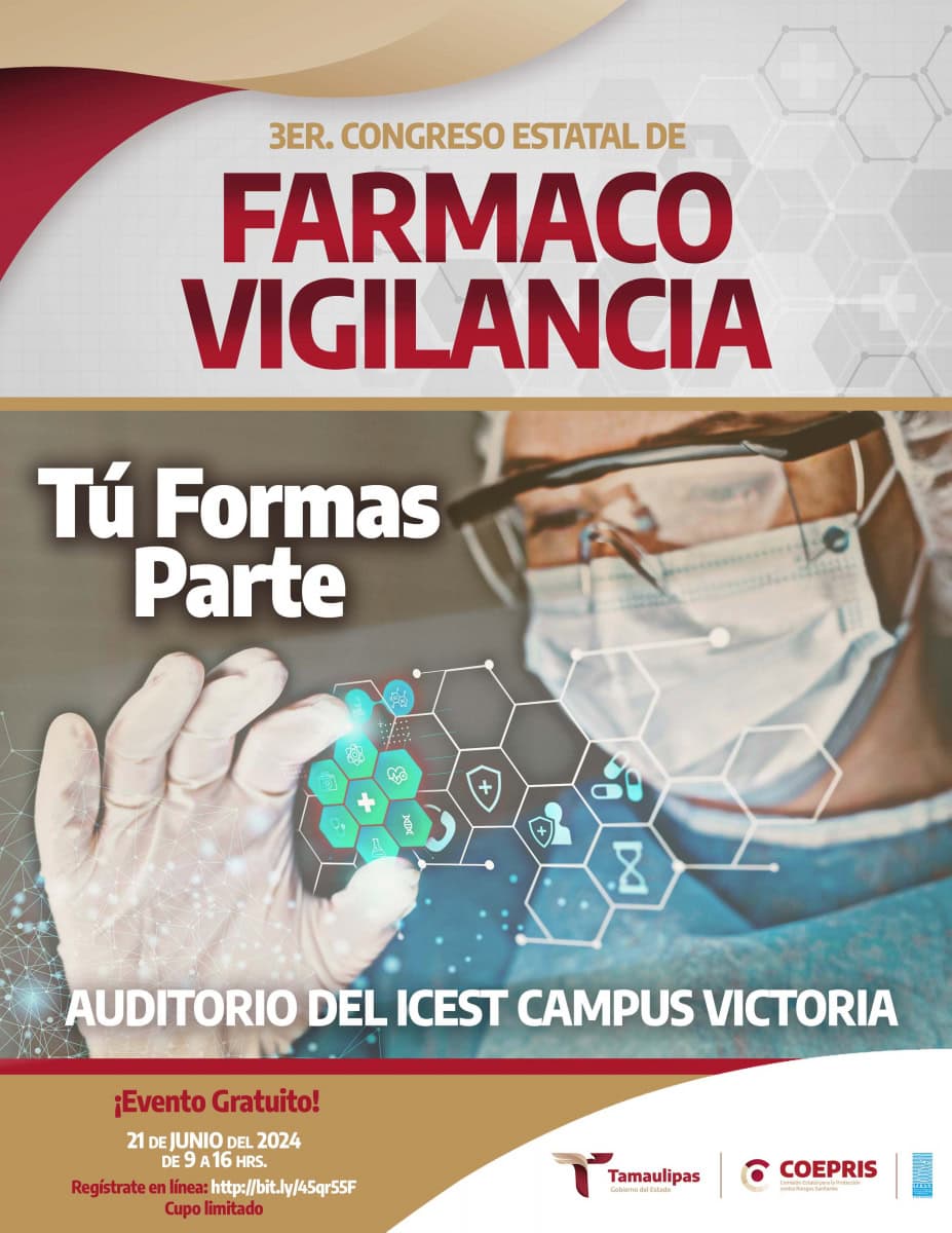 COEPRIS Tamaulipas a través del Centro Estatal de Farmacovigilancia y Tecnovigilancia te invita a participar en el Tercer Congreso Estatal de Farmacovigilancia. denominado *TU FORMAS PARTE* El cual se llevará a cabo en el Auditorio del Instituto de Ciencias y Estudios Superiores de Tamaulipas de Cd. Victoria, (ICEST) el viernes 21 de junio del 2024 de 9:00 a 16:00 horas. acceso vía remota en las Unidades Académicas de ICEST Tampico y el Hospital Regional del Rio de la Cd. de Reynosa.