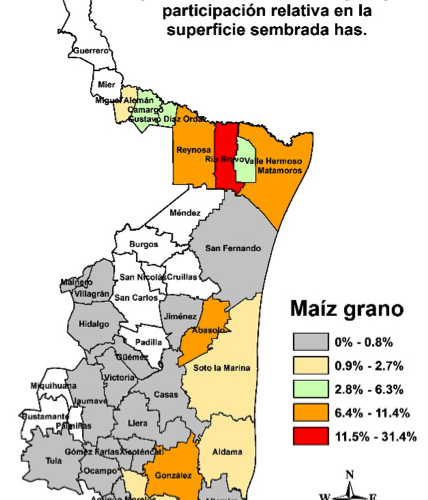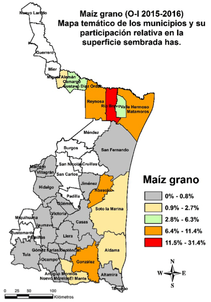 Los principales municipios que destacan en cuanto a la superficie sembrada son: Río Bravo (55,726 ha), Reynosa (20,225 ha), Matamoros (19,087 ha), Abasolo (18,061 ha), González (15,503 ha), Camargo (11,262 ha), Gustavo Díaz Ordaz (10,930 ha), Valle Hermoso (6,975 ha).