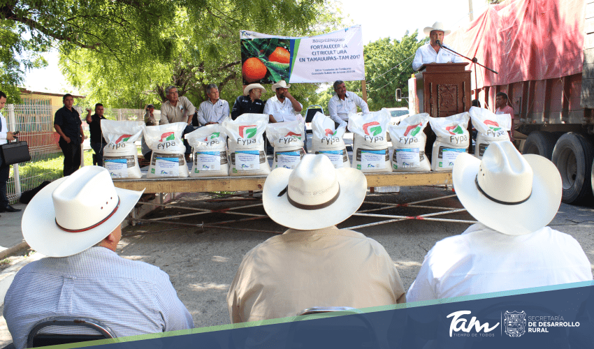 Frente a productores citrícolas de la Zona Centro, Longoria García destacó la sinergia de Ejecutivo Estatal con los citricultores al referir que la cantidad entregada del fertilizante es algo que nunca se había visto pues destacó que antes se apoyaba con solo 250 kilos y en esta Administración se otorgarán aproximadamente 600 kilos por productor, “eso nos demuestra que el Gobernador se la está jugando con la citricultura de Tamaulipas, expresó.