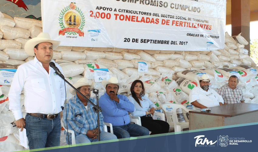 Ciudad Victoria, Tamaulipas.- Un total de mil 324 toneladas de fertilizante granulado fueron entregadas a productores citrícolas de los municipios de Padilla e Hidalgo, Tamaulipas, como parte del programa “Fortalecer la Citricultura Tam 2017” que impulsa el Gobernador del Estado Francisco García Cabeza de Vaca a través de la Secretaría de Desarrollo Rural.