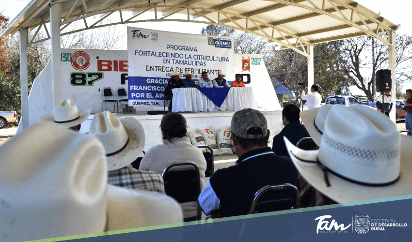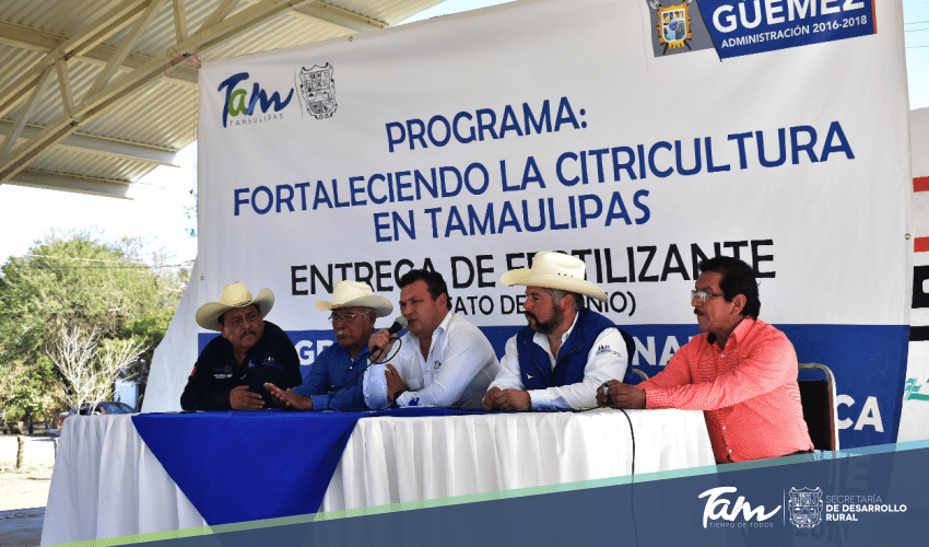 Güémez, Tamaulipas.- 70 toneladas de fertilizante granulado (Sulfato de Amonio) fueron entregadas a productores citrícolas de los ejidos El Arco, El Olmo, El Roble, Graciano Sánchez, Santa Rosa, El Porvenir, La Parrita y La Esperanza para fortalecer la citricultura en Tamaulipas, uno de los rubros que impulsa el Gobernador del Estado Francisco García Cabeza de Vaca desde el inicio de su administración.