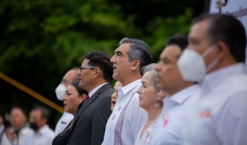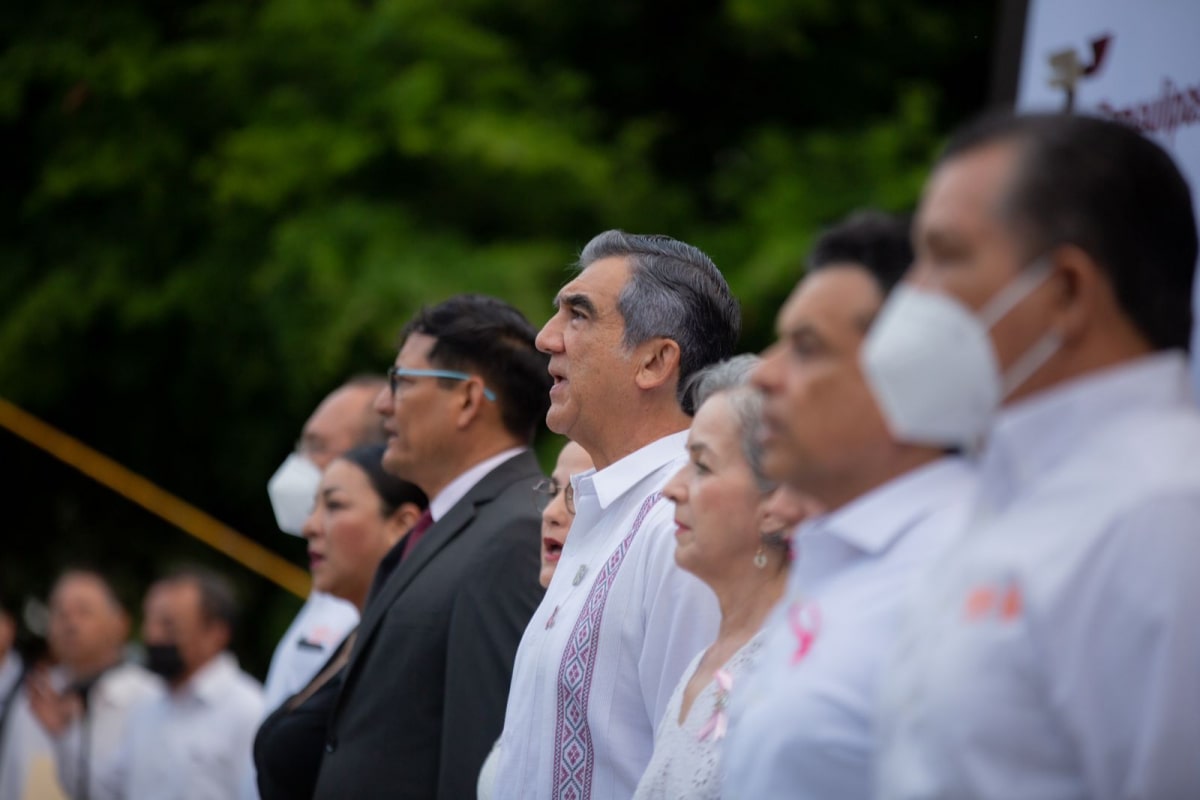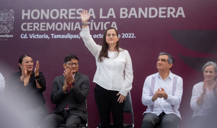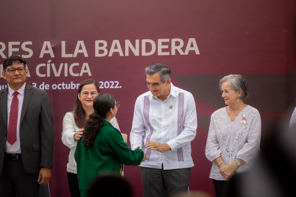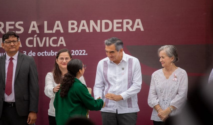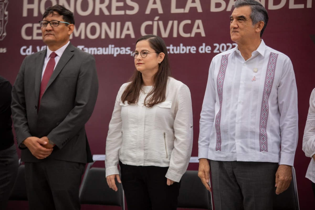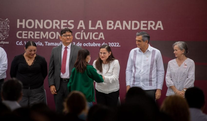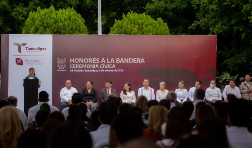 El Gobernador de Tamaulipas, Dr. Américo Villarreal Anaya y su esposa Dra. María de la Luz Santiago de Villarreal encabezaron los Honores a los Símbolos Patrios, durante una ceremonia cívica acompañado de la Secretaria de Educación, Lucía Aimé Castillo Pastor, funcionarios de su gabinete y personal de la dependencia educativa, desarrollada en la explanada de la SET, hoy lunes 03 de octubre del 2022.