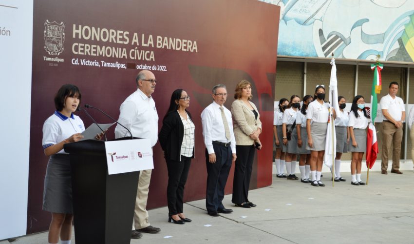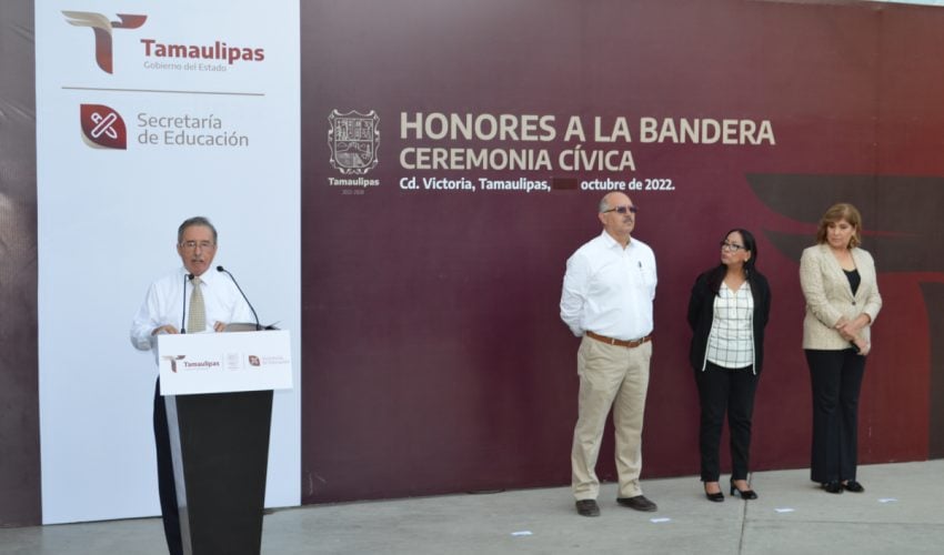 Acompañado de personal de la estructura de la SET, el Subsecretario de Educación Media Superior y Superior, Dr. Guadalupe Acosta Villarreal, presidió la ceremonia cívica de Honores a los Símbolos Patrios, acto realizado en la explanada de la Secretaría, donde mencionó que con innovación se va a provocar el cambio en los métodos de enseñanza para que la educación sea herramienta efectiva para eliminar las desigualdades.
