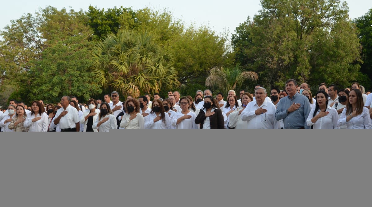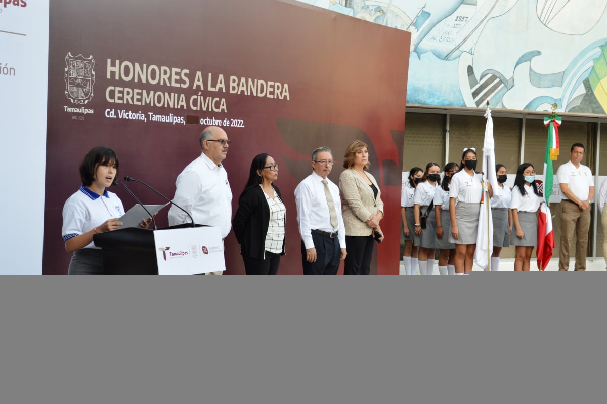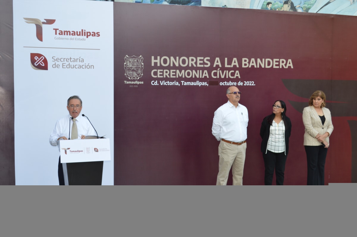 Acompañado de personal de la estructura de la SET, el Subsecretario de Educación Media Superior y Superior, Dr. Guadalupe Acosta Villarreal, presidió la ceremonia cívica de Honores a los Símbolos Patrios, acto realizado en la explanada de la Secretaría, donde mencionó que con innovación se va a provocar el cambio en los métodos de enseñanza para que la educación sea herramienta efectiva para eliminar las desigualdades.