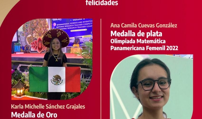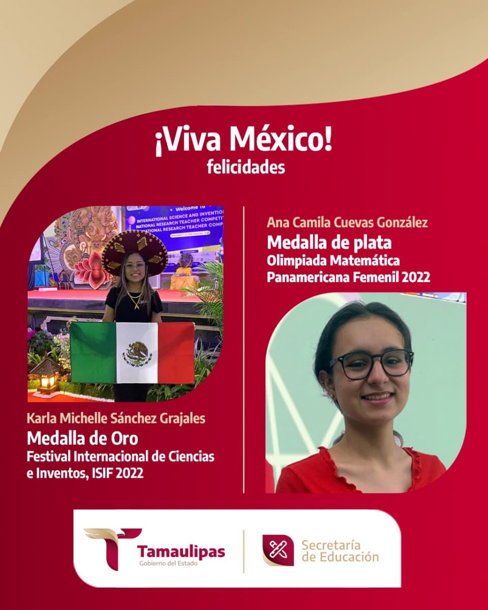 La Secretaría de Educación de Tamaulipas felicita y reconoce a Karla Michelle Sánchez Grajales y a Ana Camila Cuevas González, por haber obtenido Medalla de Oro en el Festival Internacional de Ciencias e Inventos, ISIF 2022 y Medalla de Plata en la Olimpiada Panamericana de Matemáticas Femenil, PAGMO 2022, respectivamente.