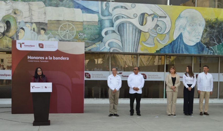 Hoy lunes 27 de febrero se inició la semana con la Ceremonia Cívica de Honores a nuestra Bandera, encabezada por la subsecretaria de Planeación, Ma. del Refugio Varela Reyes, acompañada de la estructura educativa y personal que labora en la Secretaría de Educación de Tamaulipas.