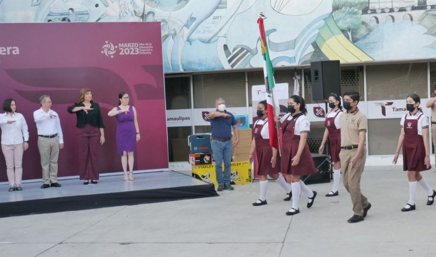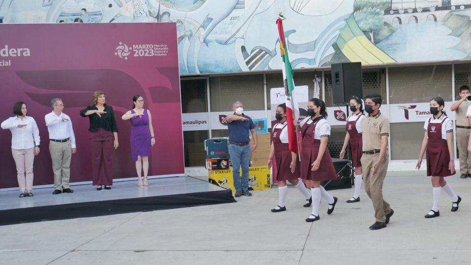 Hoy lunes 06 de marzo se inicia la semana con actividades en el marco de “Marzo, mes de la Educación Especial e Inclusiva” con la Ceremonia Cívica de Honores a nuestra Bandera, encabezada por la secretaria de Educación de Tamaulipas, Lucía Aimé Castillo Pastor, acompañada de la estructura educativa, personal que labora en la dependencia, así como estudiantes, docentes y directivos de varios Centros de Atención Múltiple (C.A.M) y escuelas inclusivas de la localidad, quienes participaron en el evento cívico.