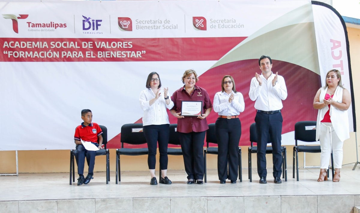 Para reafirmar los valores y la disciplina a través del estudio, el deporte y las actividades extraescolares donde participan estudiantes, maestros y padres de familia, el Sistema DIF Tamaulipas que preside la doctora María Santiago de Villarreal, sigue impulsando la Academia Social de Valores denominada “Formación para el Bienestar”.