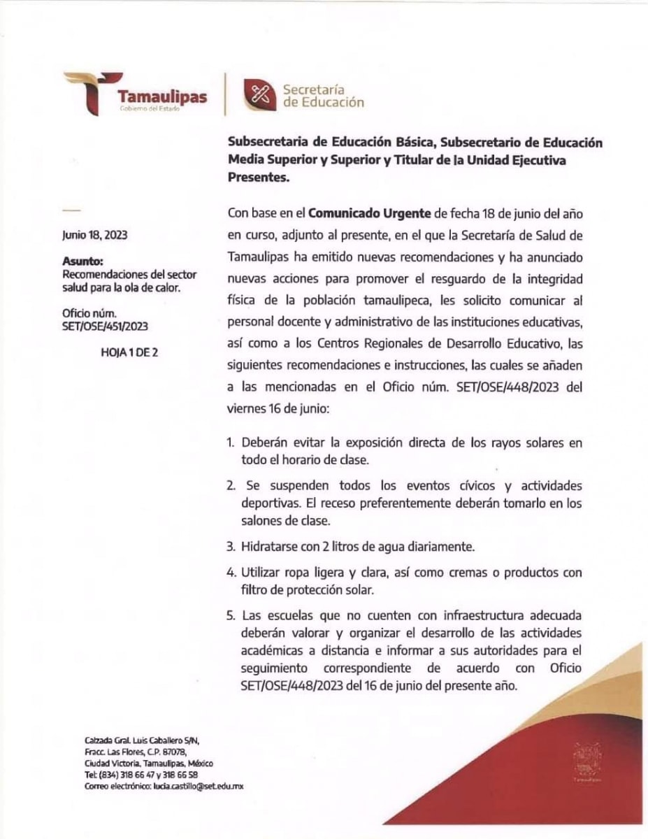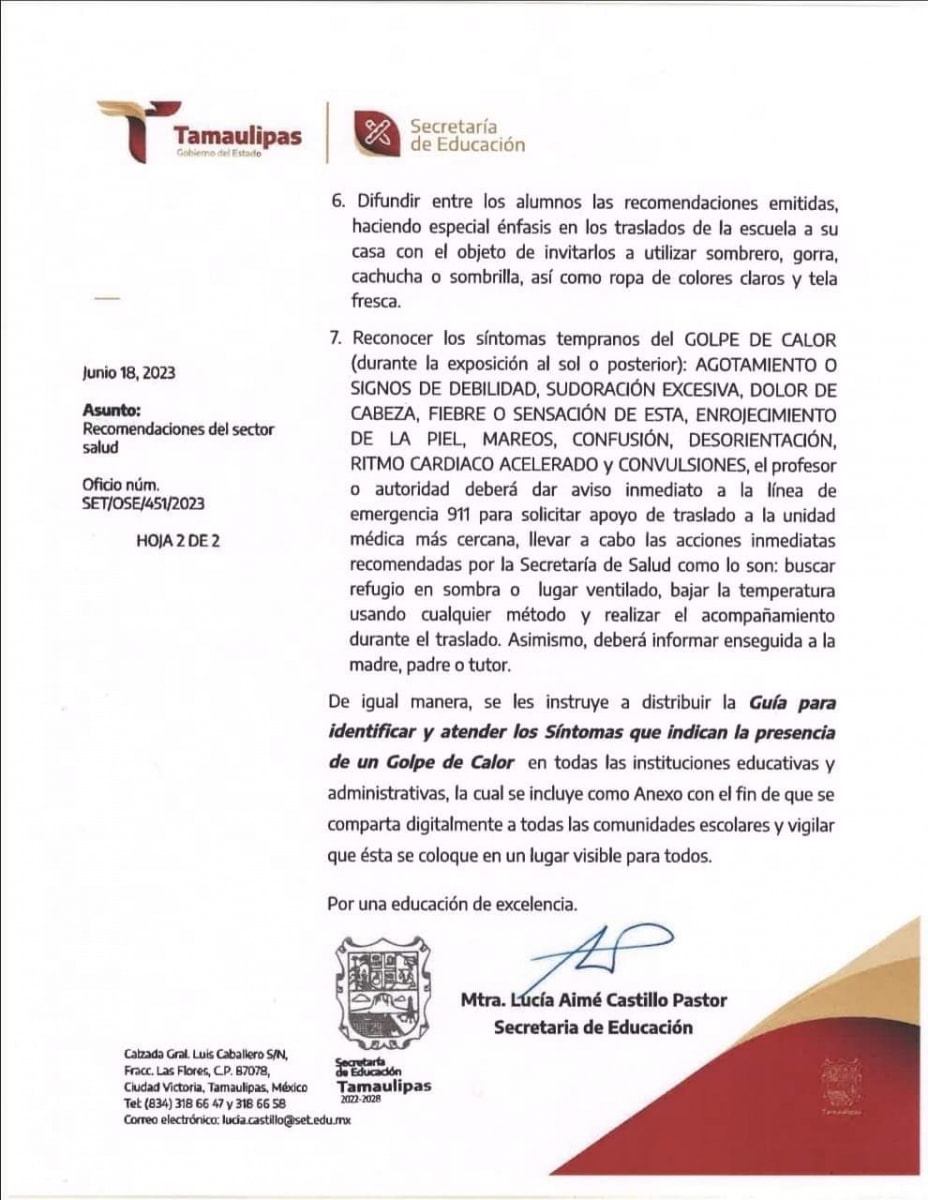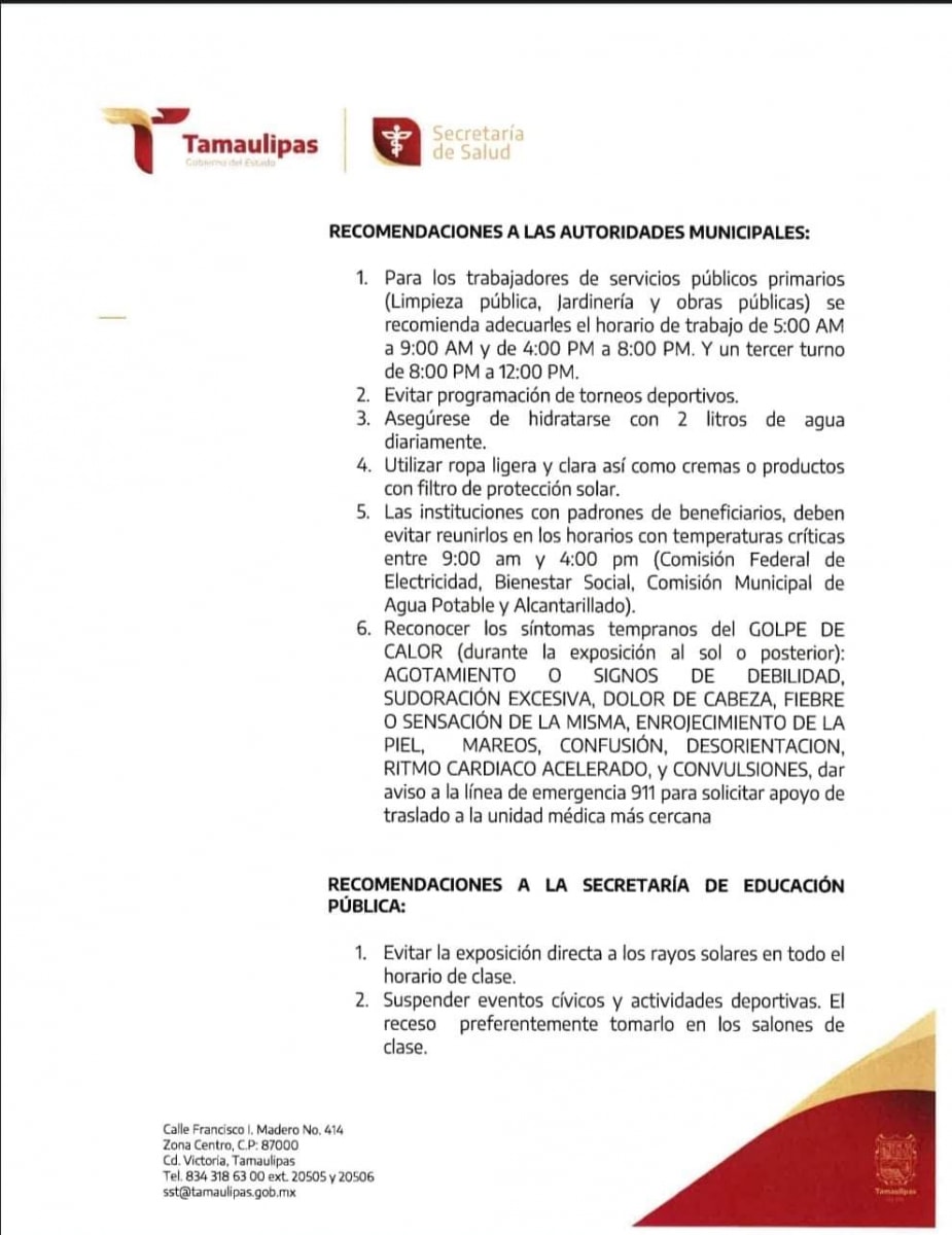 Ante las altas temperaturas que se registran en la entidad, la Secretaría de Salud de Tamaulipas nos mantiene informados con estos importantes datos:
