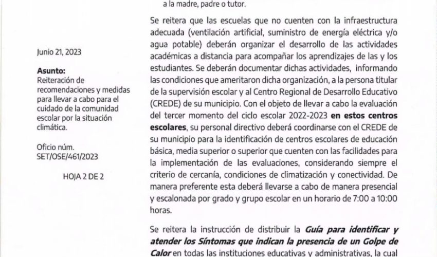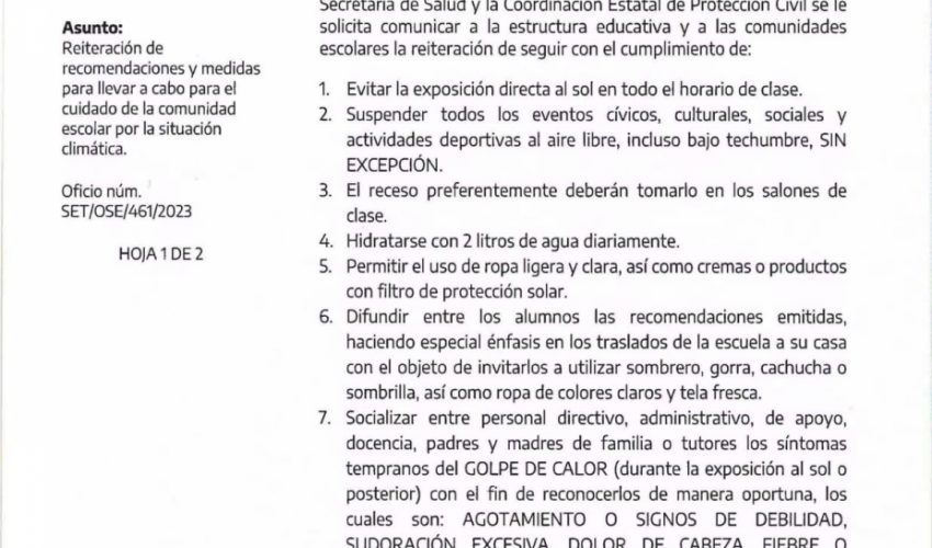 Con la permanencia de las altas temperaturas que se registran en la entidad, reiteramos las recomendaciones y medidas establecidas por las autoridades de Secretaría de Salud de Tamaulipas y Protección Civil Tamaulipas para conocimiento y observancia por la estructura educativa y la comunidad escolar.