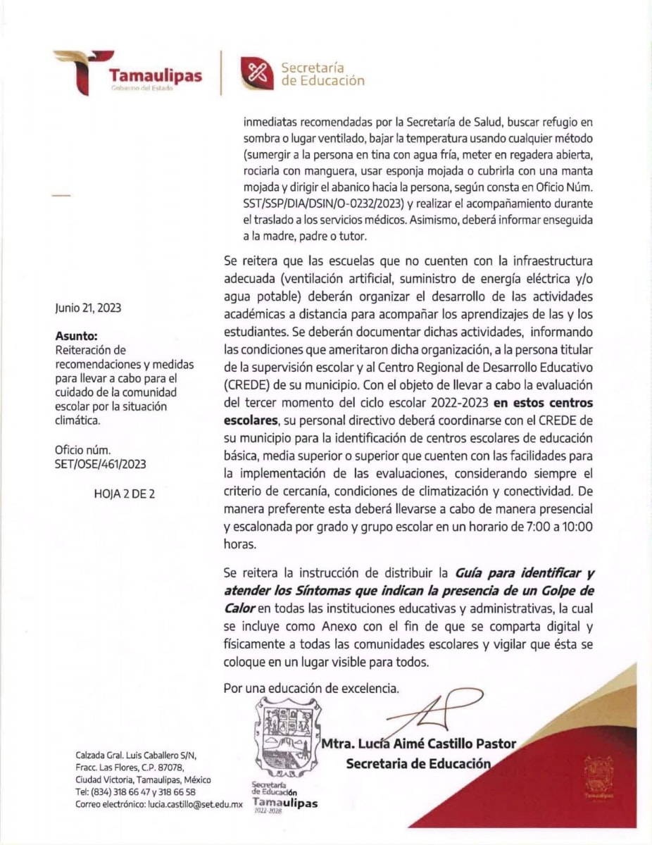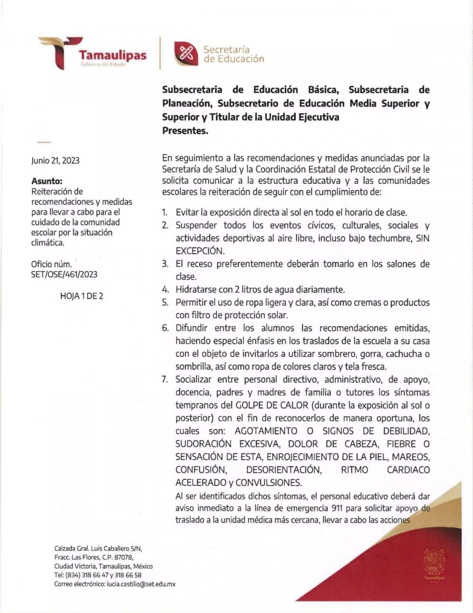 Con la permanencia de las altas temperaturas que se registran en la entidad, reiteramos las recomendaciones y medidas establecidas por las autoridades de Secretaría de Salud de Tamaulipas y Protección Civil Tamaulipas para conocimiento y observancia por la estructura educativa y la comunidad escolar.
