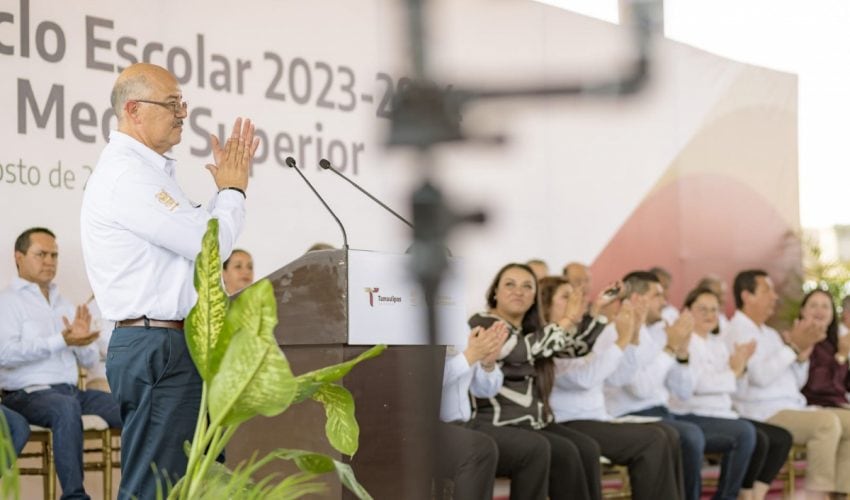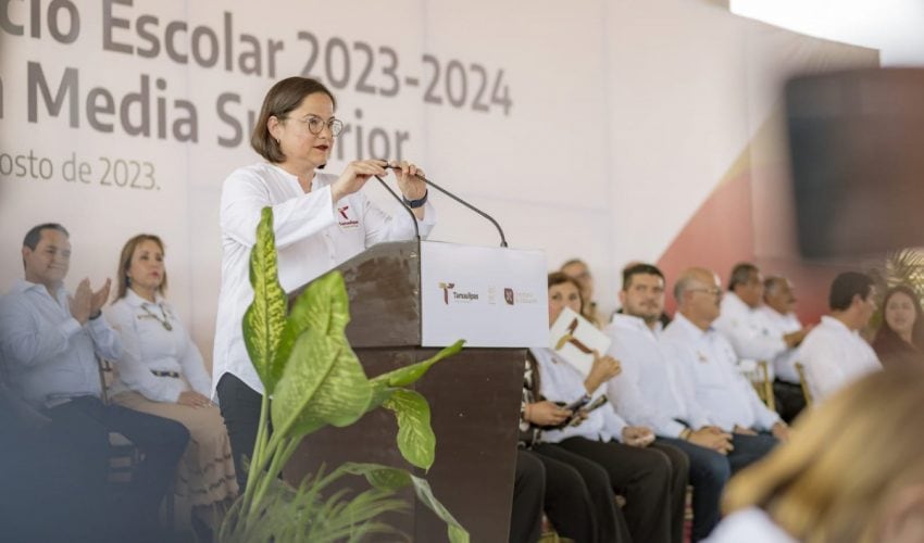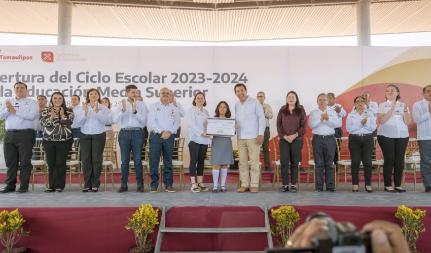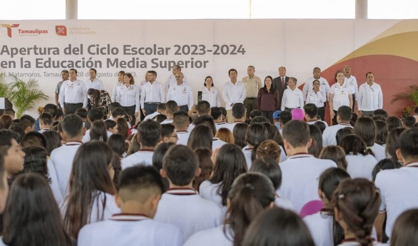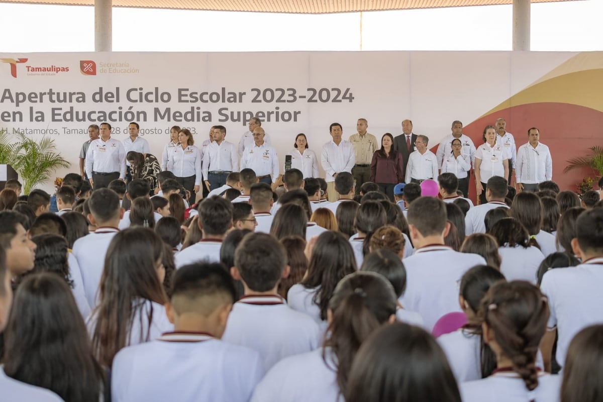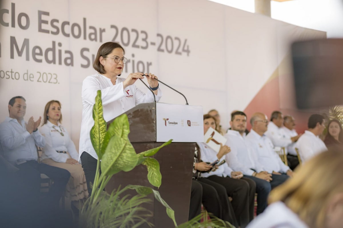 Después de acompañar al gobernador Américo Villarreal Anaya en la Ceremonia de Inicio de Ciclo Escolar 2023-2024 en Educación Básica, realizada en San Fernando, donde se entregaron paquetes de útiles escolares y los nuevos ejemplares de Libros de Texto Gratuitos; Lucía Aimé, en compañía de autoridades municipales y educativas de los diferentes subsistemas de educación media superior, felicitó y convocó a los presentes a comprometerse para alcanzar una educación de excelencia, destacando la inversión que el Gobernador está realizando en el estado, a través de becas, infraestructura y diversos apoyos a los más vulnerables como son uniformes, mochilas y útiles escolares.