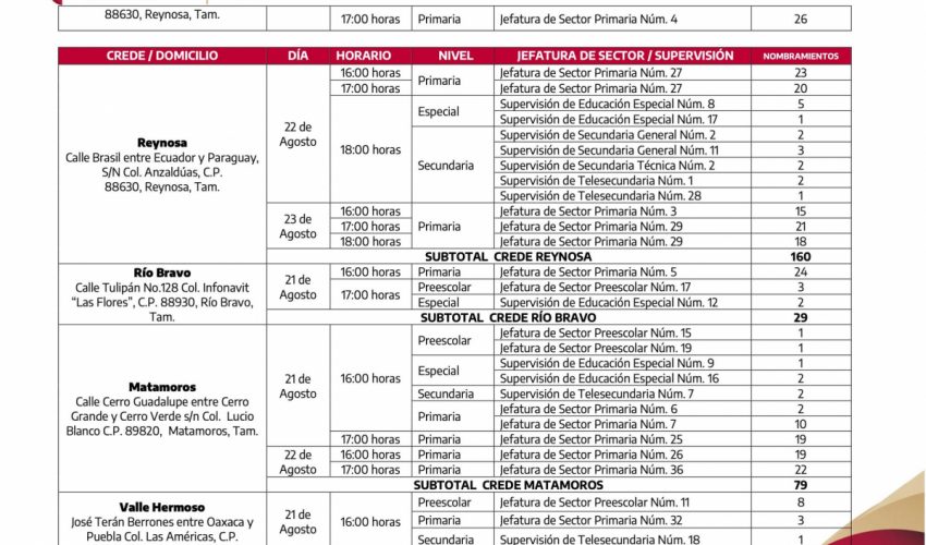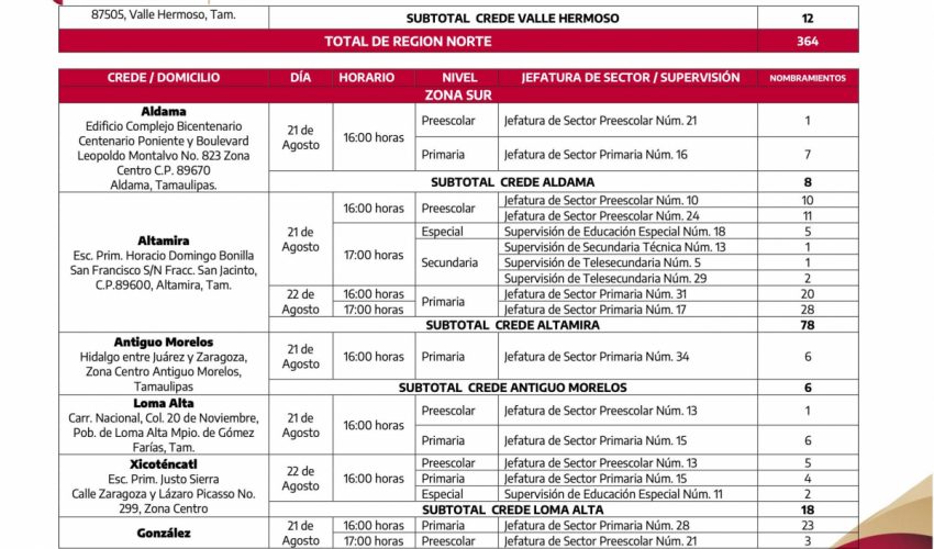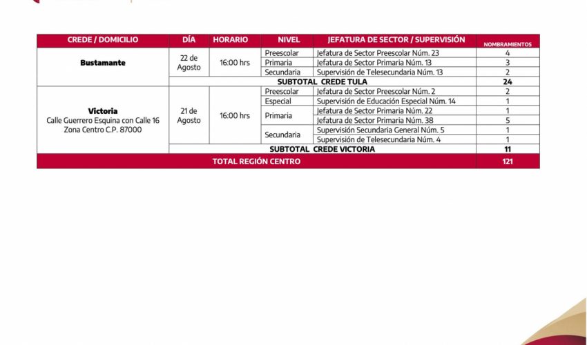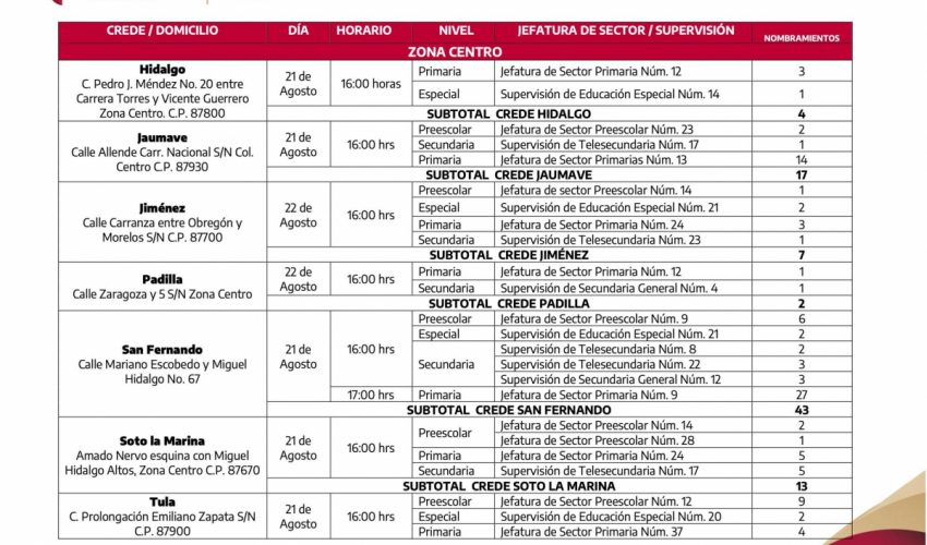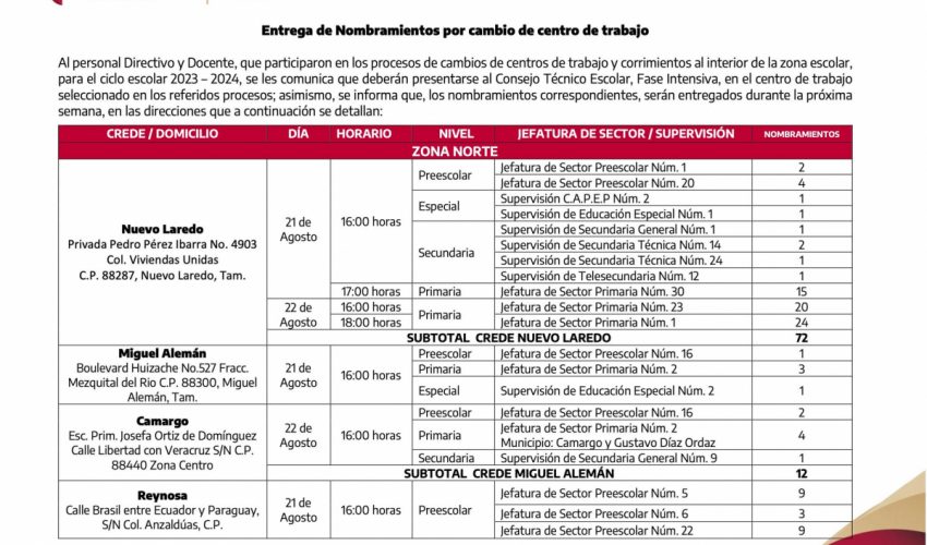 Al personal Directivo y Docente, que participaron en los procesos de cambios de centros de trabajo y corrimientos al interior de la zona escolar, para el ciclo escolar 2023 – 2024, se les comunica que deberán presentarse al Consejo Técnico Escolar, Fase Intensiva, en el centro de trabajo seleccionado en los referidos procesos; asimismo, se informa que, los nombramientos correspondientes, serán entregados durante la próxima semana, en las direcciones que a continuación se detallan.