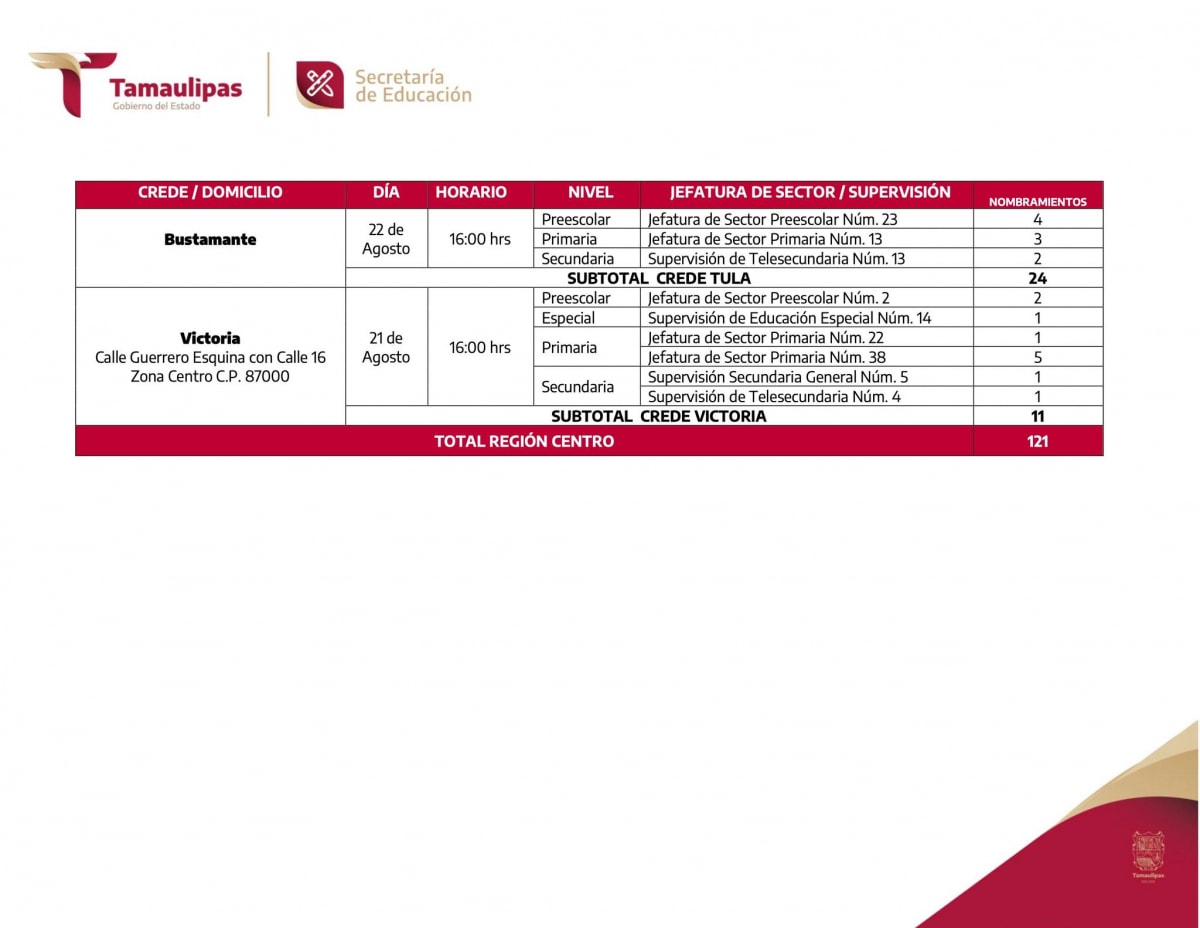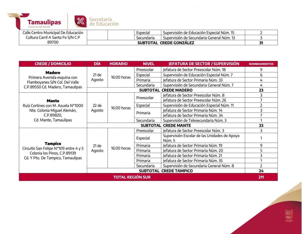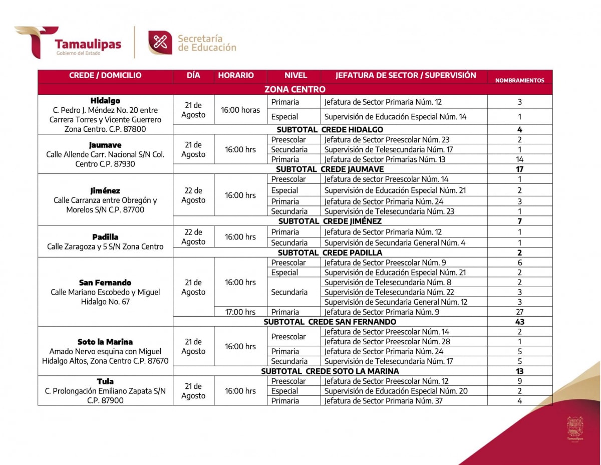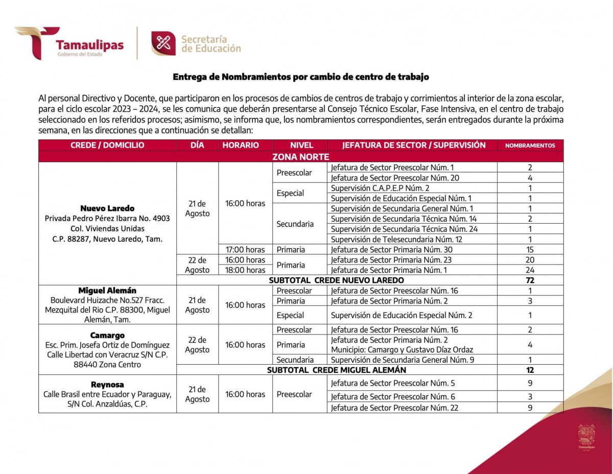Al personal Directivo y Docente, que participaron en los procesos de cambios de centros de trabajo y corrimientos al interior de la zona escolar, para el ciclo escolar 2023 – 2024, se les comunica que deberán presentarse al Consejo Técnico Escolar, Fase Intensiva, en el centro de trabajo seleccionado en los referidos procesos; asimismo, se informa que, los nombramientos correspondientes, serán entregados durante la próxima semana, en las direcciones que a continuación se detallan.