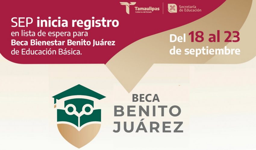 En Tamaulipas del 18 al 23 de septiembre se realiza el proceso de registro para la solicitud en línea a la lista de espera, para ser beneficiaria o beneficiario de la Beca para el Bienestar Benito Juárez de Educación Básica; dirigida a familias con hijas, hijos o menores a su cuidado en educación inicial, preescolar, primaria o secundaria y que estudien en escuelas clasificadas como Prioritaria o Susceptible de Atención.
