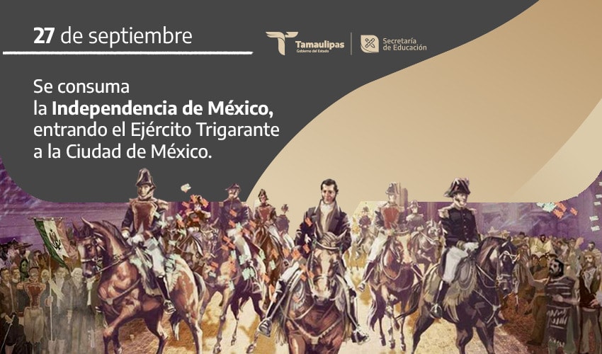 El 27 de septiembre de 1821, el Ejército Trigarante entra triunfal a la Ciudad de México tras una campaña iniciada el 4 de febrero del mismo año, fecha esta cuando se proclamó el Plan de Iguala, documento donde se declaraba a la entonces Nueva España como un país soberano e independiente, y que ahora es nuestra nación.