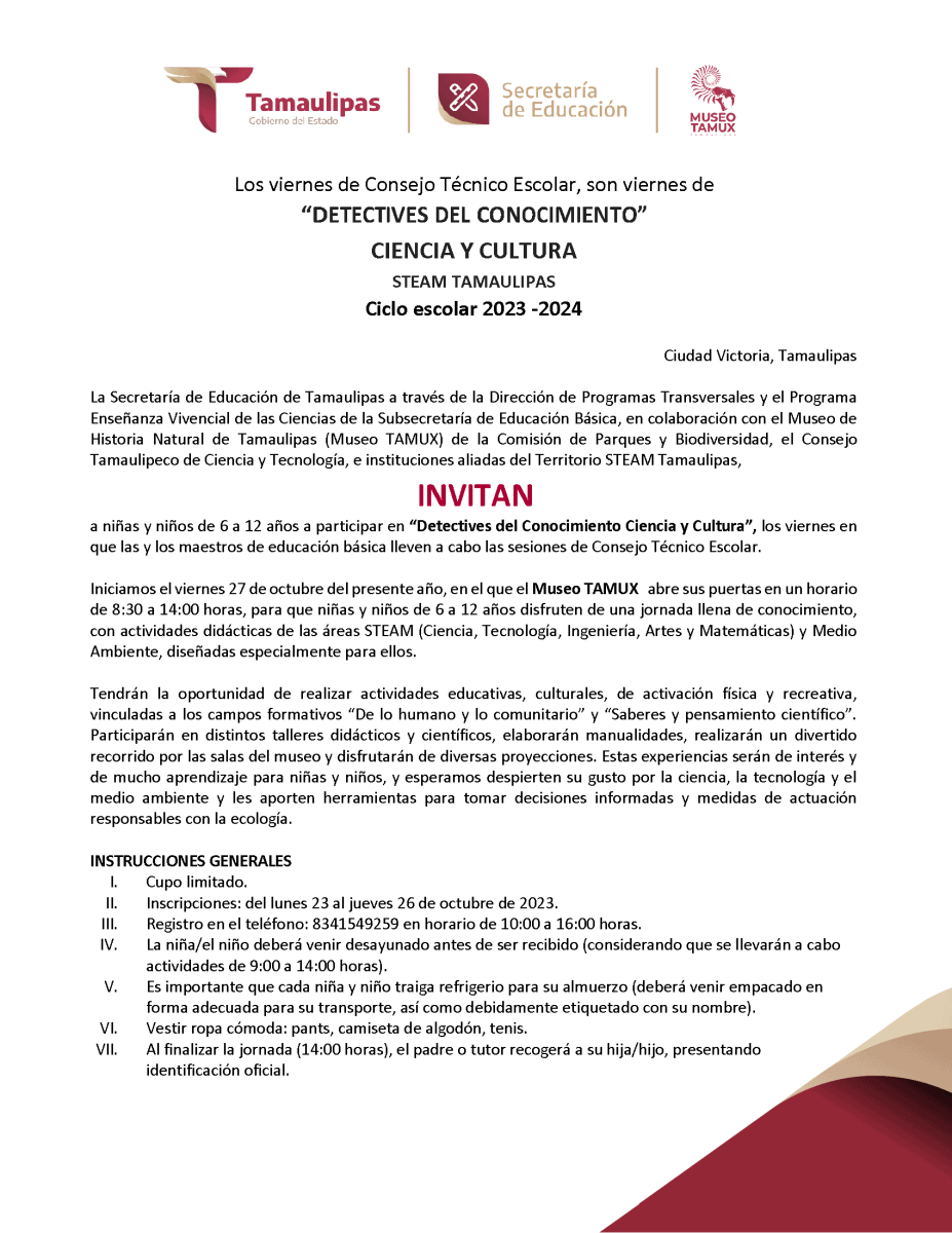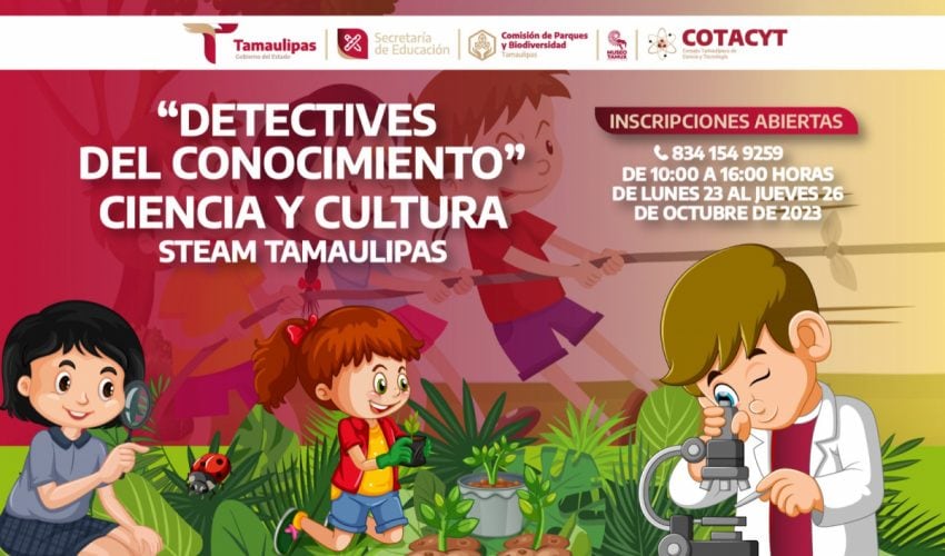 Niñas y niños de 6 a 12 años se les invita a participar en “Detectives del Conocimiento Ciencia y Cultura”, el próximo viernes 27 de octubre, en el Museo TAMUX, de 8:30 a 14:00 horas, para que disfruten de una jornada llena de conocimiento, con actividades didácticas de las áreas STEAM (Ciencia, Tecnología, Ingeniería, Artes y Matemáticas) y Medio Ambiente.