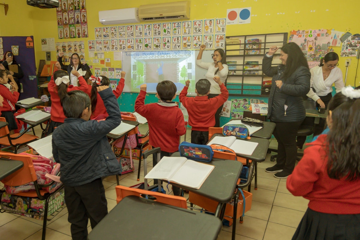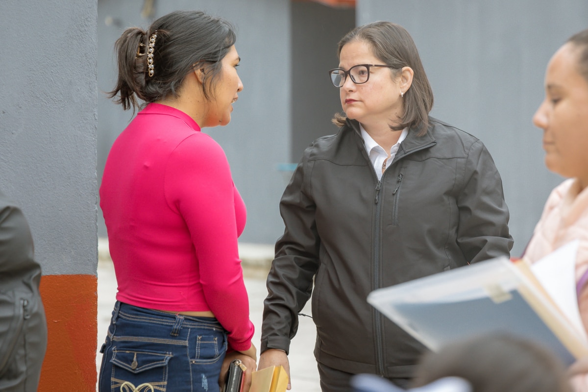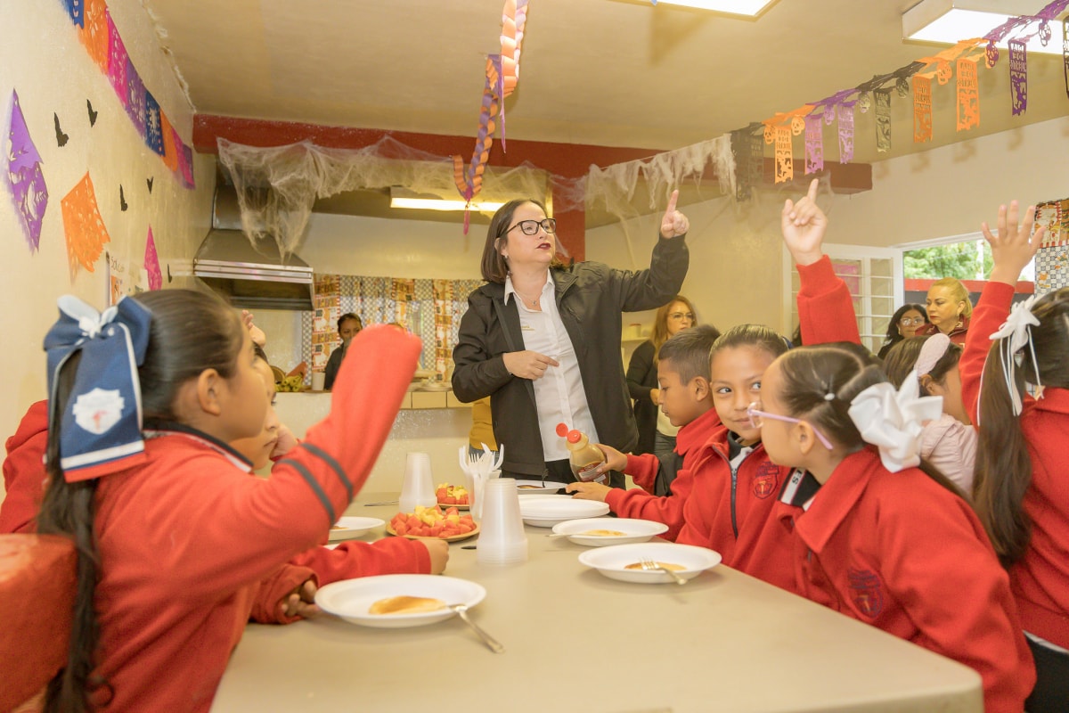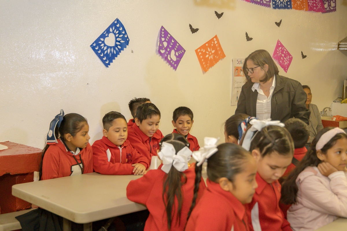 Durante su recorrido por las aulas, la titular de la SET participó en las actividades educativas junto a las niñas y niños del plantel, los acompañó en su desayuno e hizo un trayecto por las distintas áreas de la escuela.