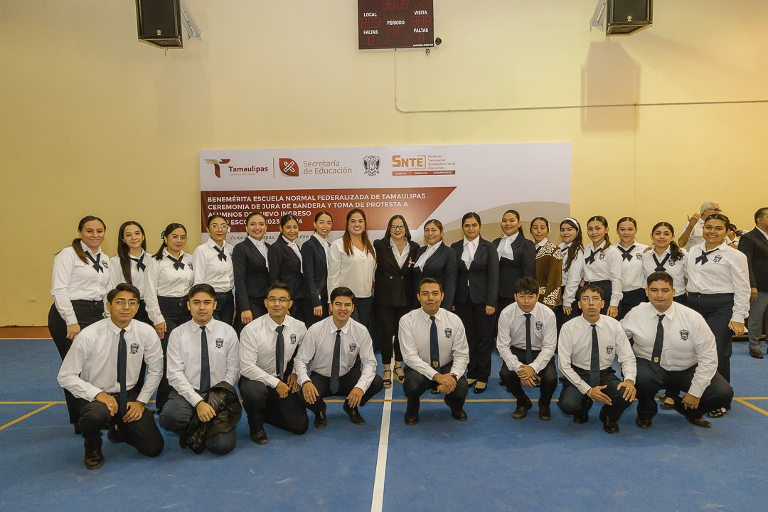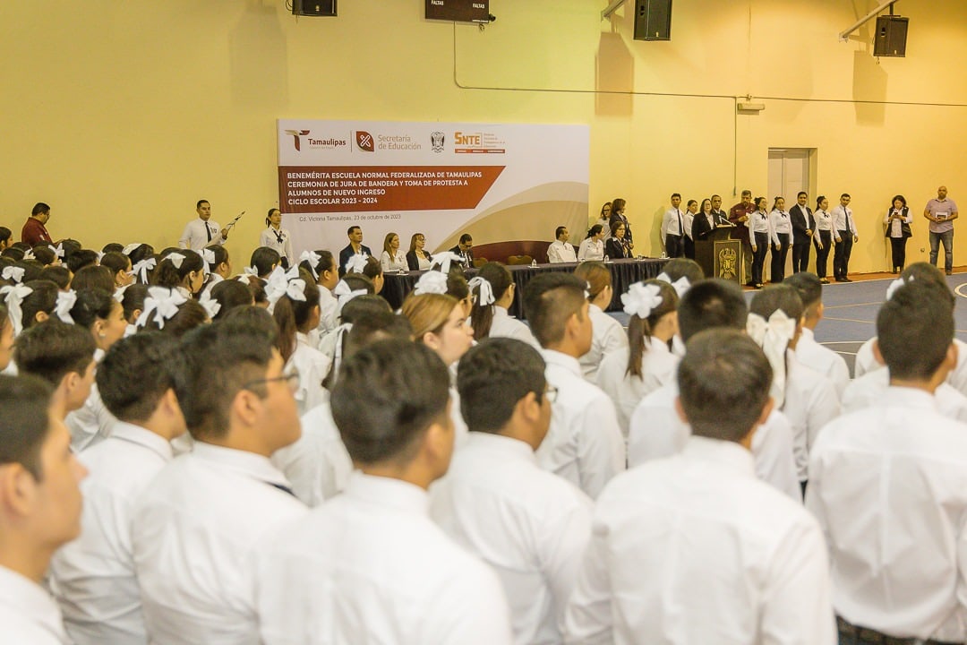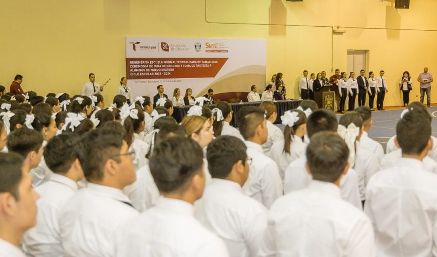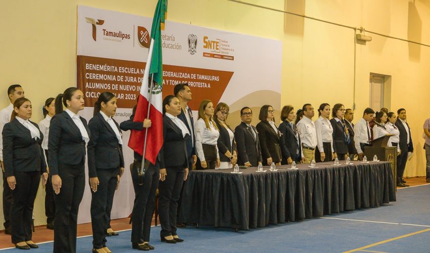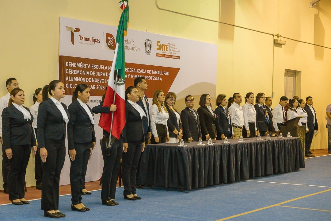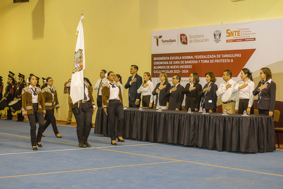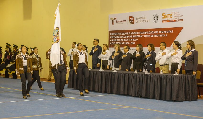 Este lunes la secretaria de Educación de Tamaulipas, Lucía Aimé Castillo Pastor, presidió la ceremonia de Honores a la Bandera efectuada en la Benemérita Escuela Normal Federalizada de Tamaulipas, en ciudad Victoria; durante el evento, acompañada de la Dra. Nora Imelda González Salazar, Directora de la Escuela Normal, se llevó a cabo la Toma de Protesta de las y los estudiantes de nuevo ingreso a las Licenciaturas en Educación Primaria e Inclusión Educativa.