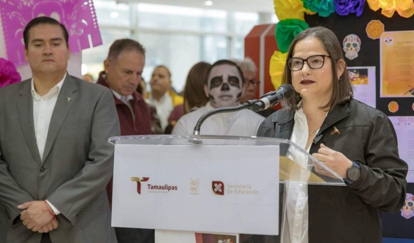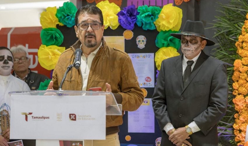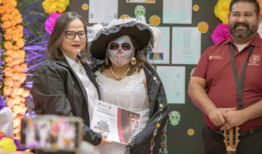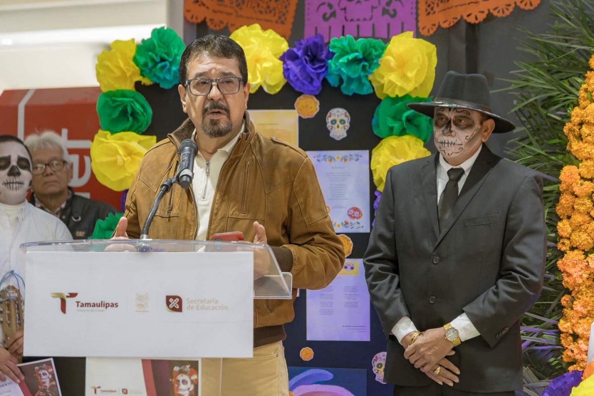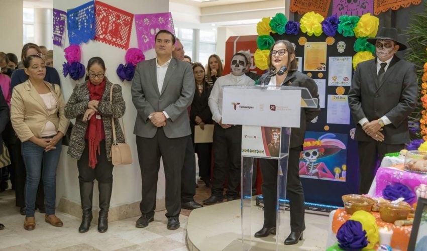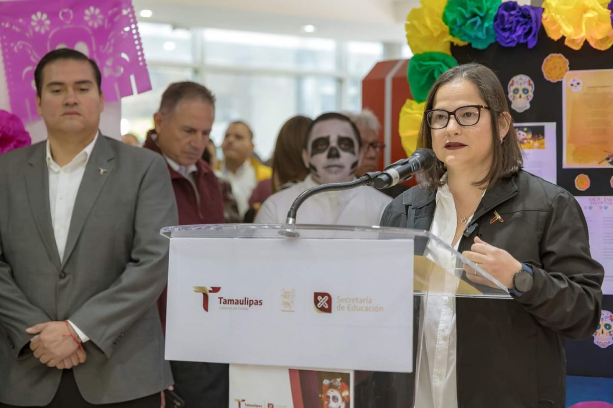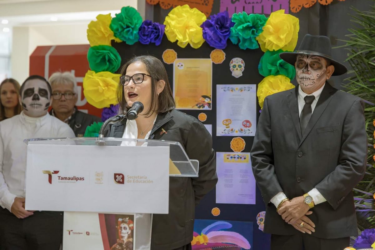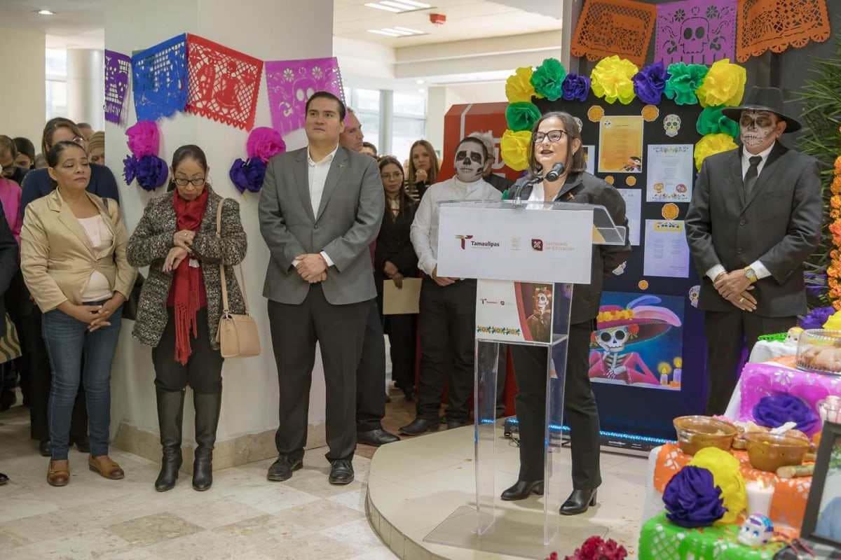 En el marco de la celebración del Día de Muertos, con la participación de los trabajadores de la Unidad Ejecutiva, Subsecretaria Media Superior y Superior, Subsecretaria de Planeacion y del Consejo Tamaulipeco de Ciencia y Tecnología, la secretaria de Educación en Tamaulipas, Lucía Aimé Castillo Pastor, participó en la presentación del Altar de Muertos instalado en la planta baja de la Torre Gubernamental “José López Portillo“ .
