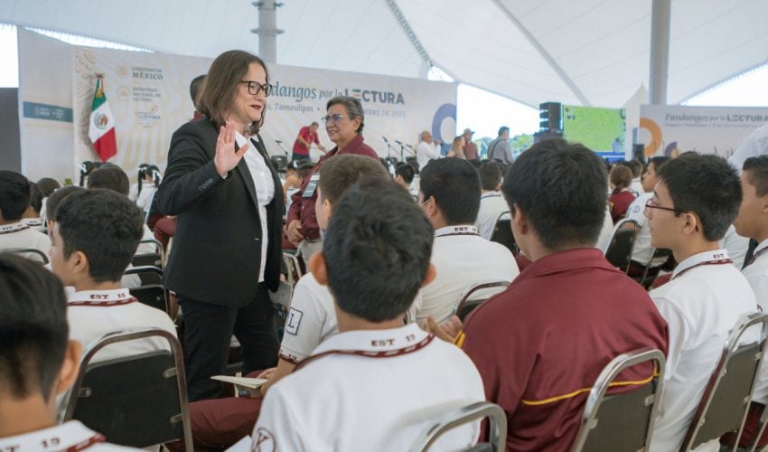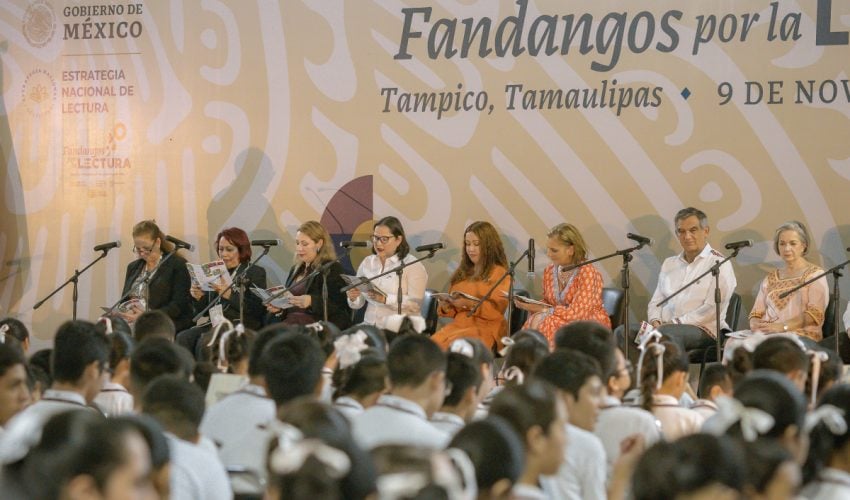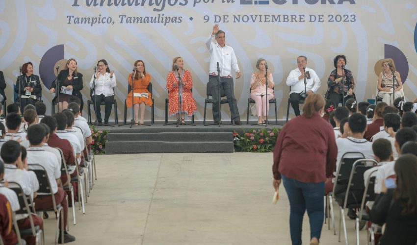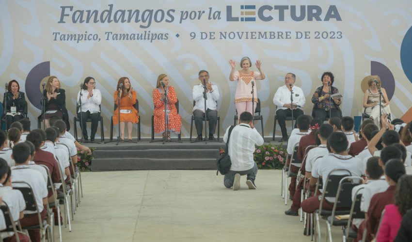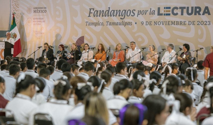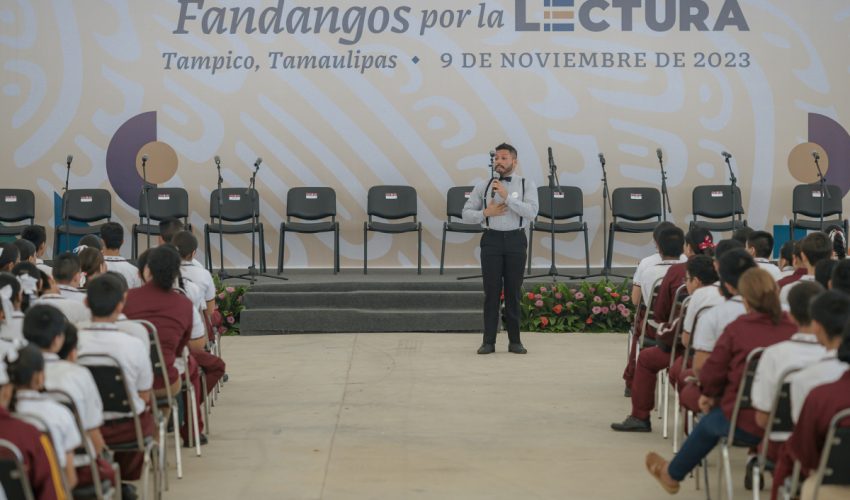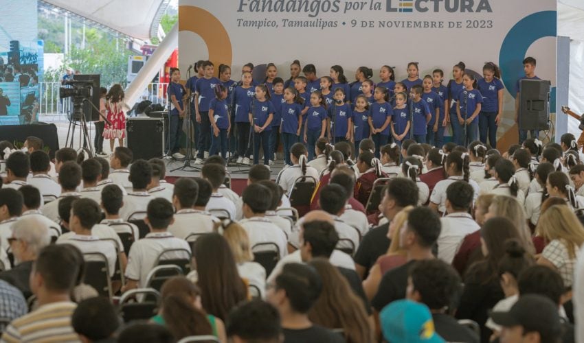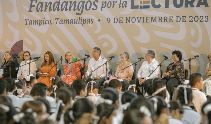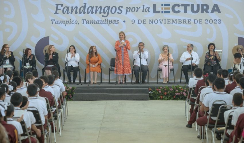 Con mucha alegría y entusiasmo, las y los estudiantes, directivos y personal docente de la Secundaria Técnica No. 19 «Natividad Garza Leal”, de Ciudad Madero, participaron junto al gobernador Américo Villarreal Anaya, la Presidenta del Sistema DIF Tamaulipas, y la escritora e investigadora Beatriz Gutiérrez Müller, en la edición número 23 de ‘Fandangos por la Lectura’, en la que se leyeron textos de poetas y escritoras contemporáneas.