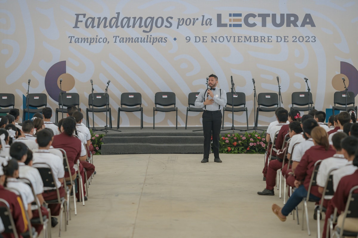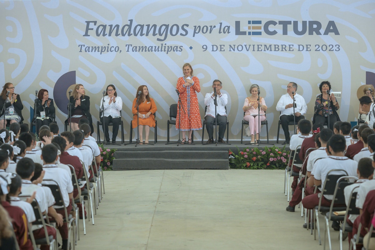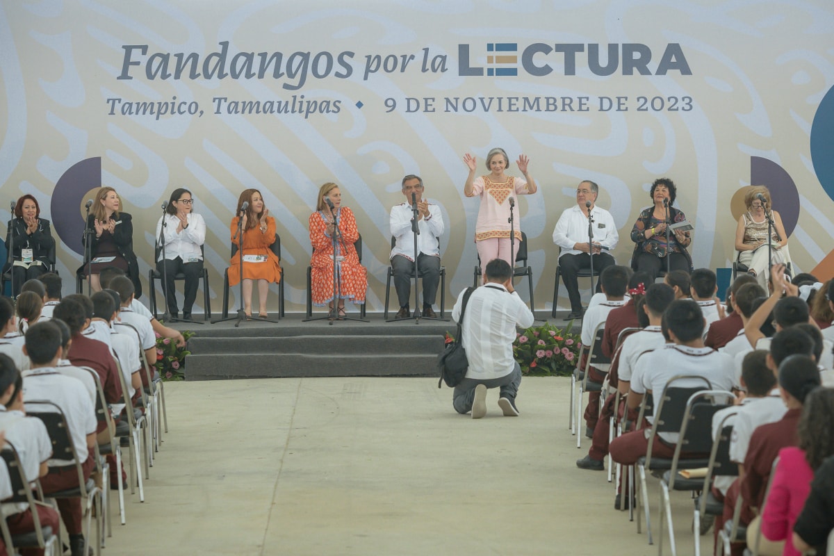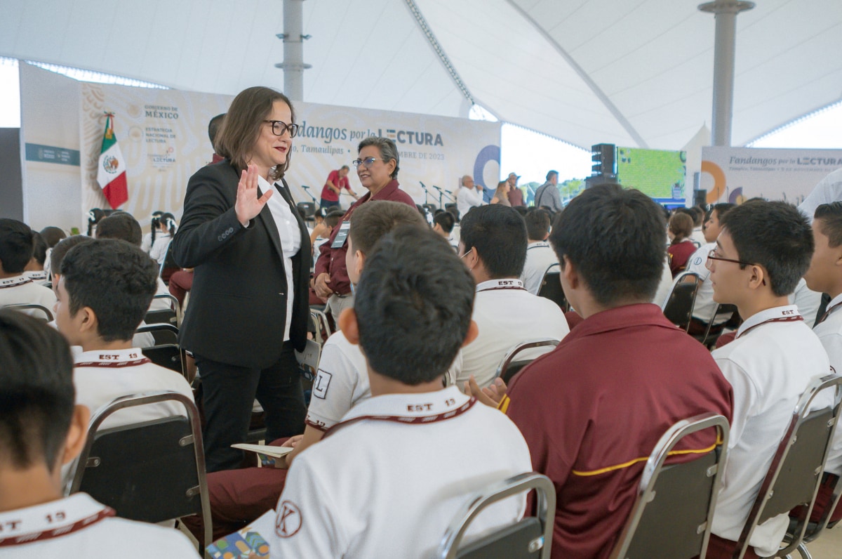 Con mucha alegría y entusiasmo, las y los estudiantes, directivos y personal docente de la Secundaria Técnica No. 19 «Natividad Garza Leal”, de Ciudad Madero, participaron junto al gobernador Américo Villarreal Anaya, la Presidenta del Sistema DIF Tamaulipas, y la escritora e investigadora Beatriz Gutiérrez Müller, en la edición número 23 de ‘Fandangos por la Lectura’, en la que se leyeron textos de poetas y escritoras contemporáneas.