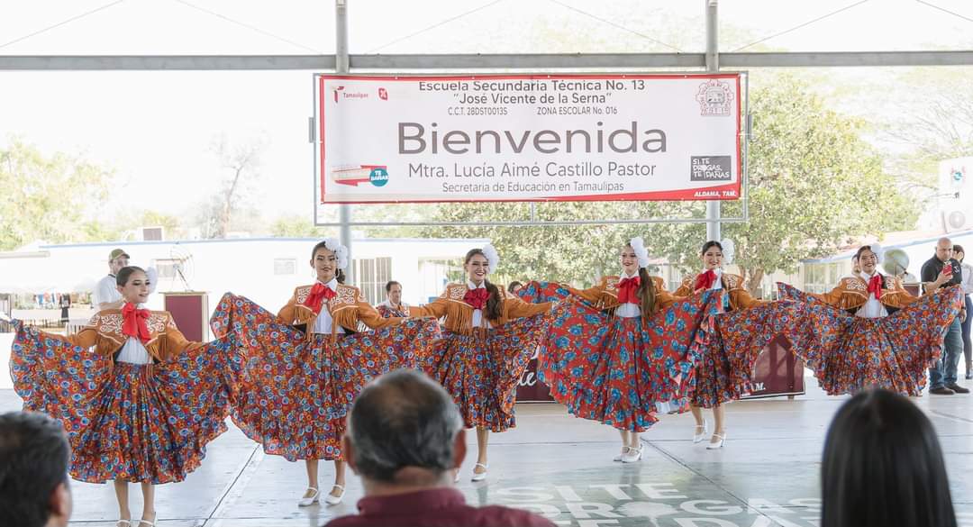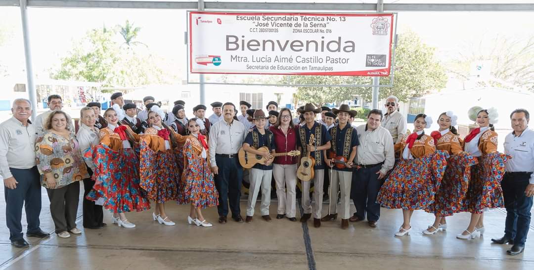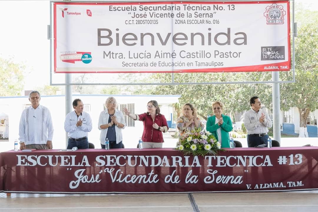 En permanente trabajo recorriendo las escuelas de Tamaulipas, con el objetivo de promover espacios de diálogo y acuerdos con el personal del sector educativo, estudiantes, madres y padres de familia, la secretaria de Educación en el Estado, Lucía Aimé Castillo Pastor, visitó la Escuela Secundaria Técnica No. 13 “José Vicente de la Serna” en el municipio de Aldama, donde acompañó a la comunidad educativa en sus actividades artísticas y musicales.