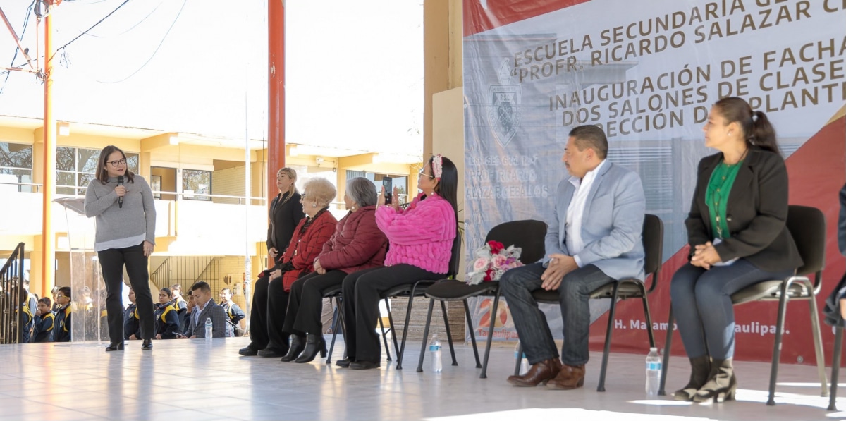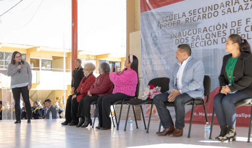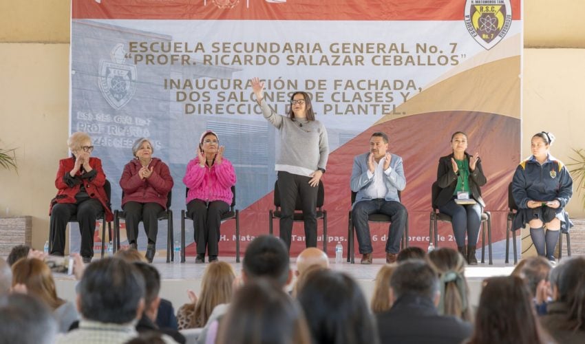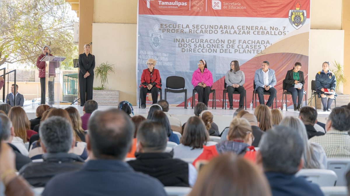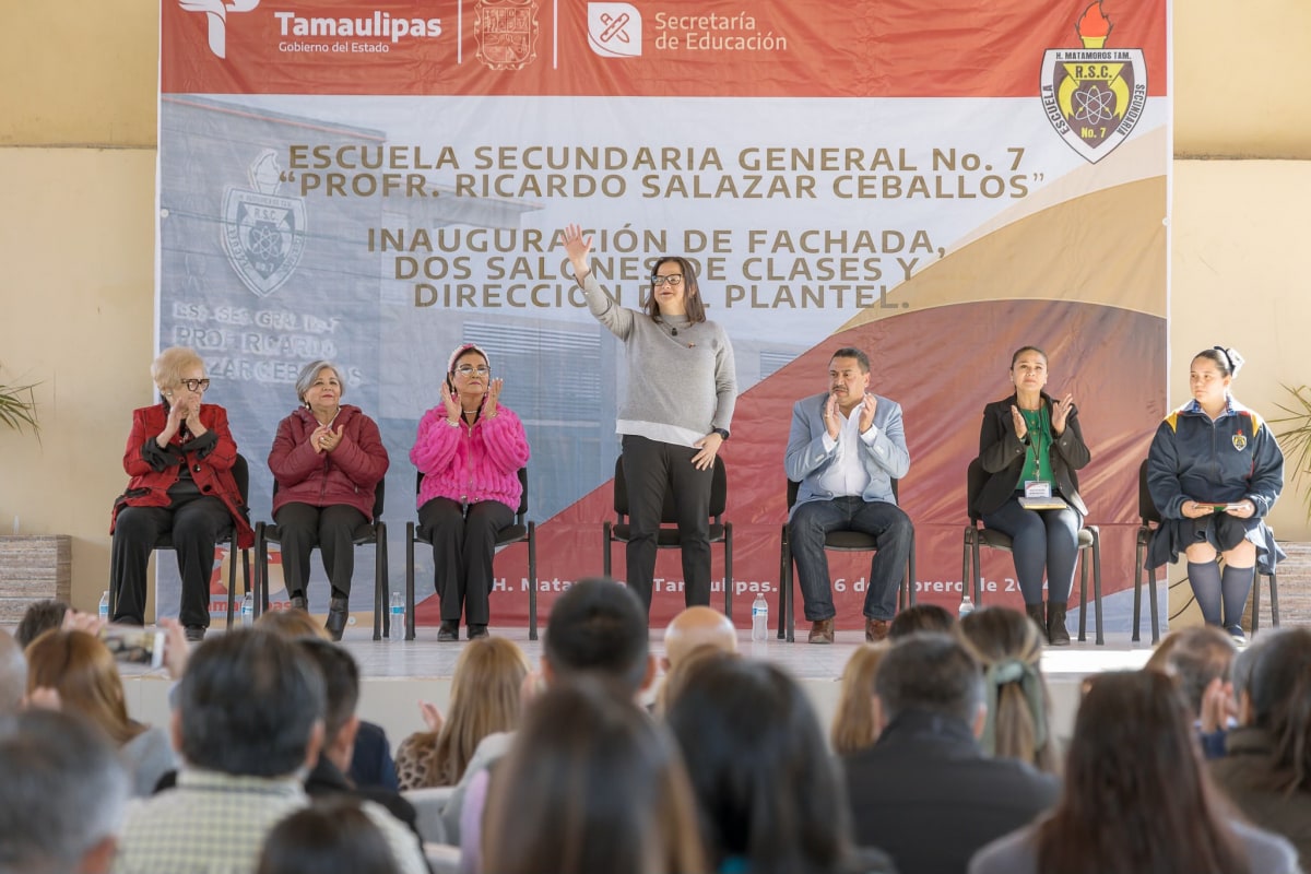 En gira de trabajo por el municipio de Matamoros, la secretaria de Educación de Tamaulipas, visitó la Secundaria General No. 7 “Prof. Ricardo Salazar Ceballos”, donde en compañía de su director, Naif José Hamsho Ibarra, docentes, madres, padres de familias, estudiantes y autoridades municipales, inauguró dos aulas de clases, la dirección administrativa y la fachada del plantel.