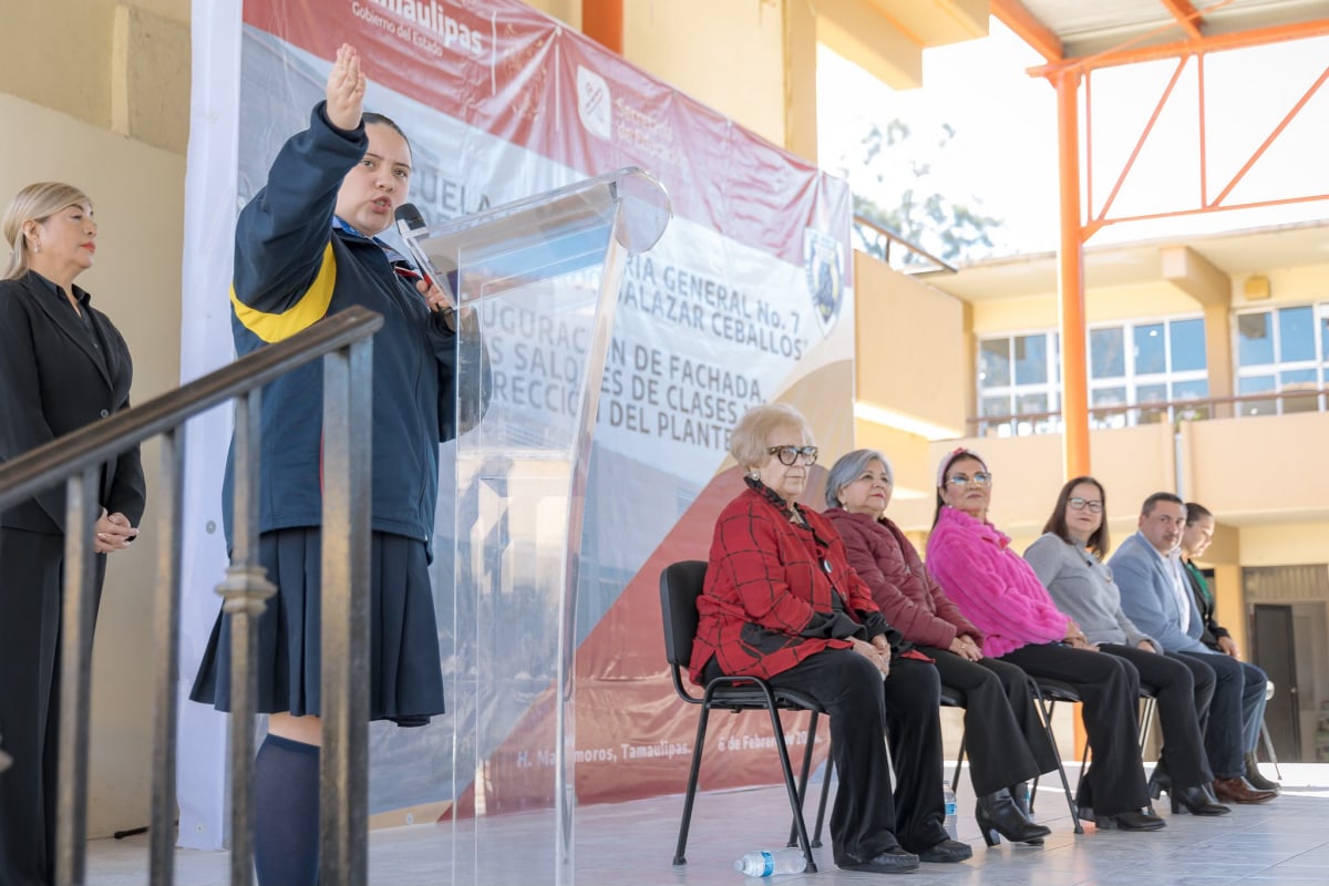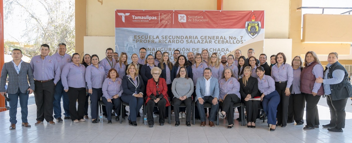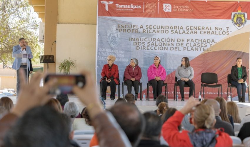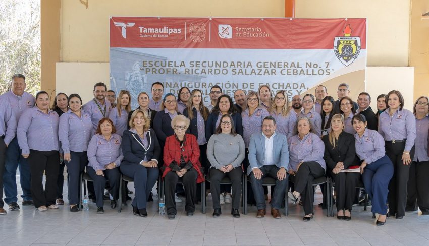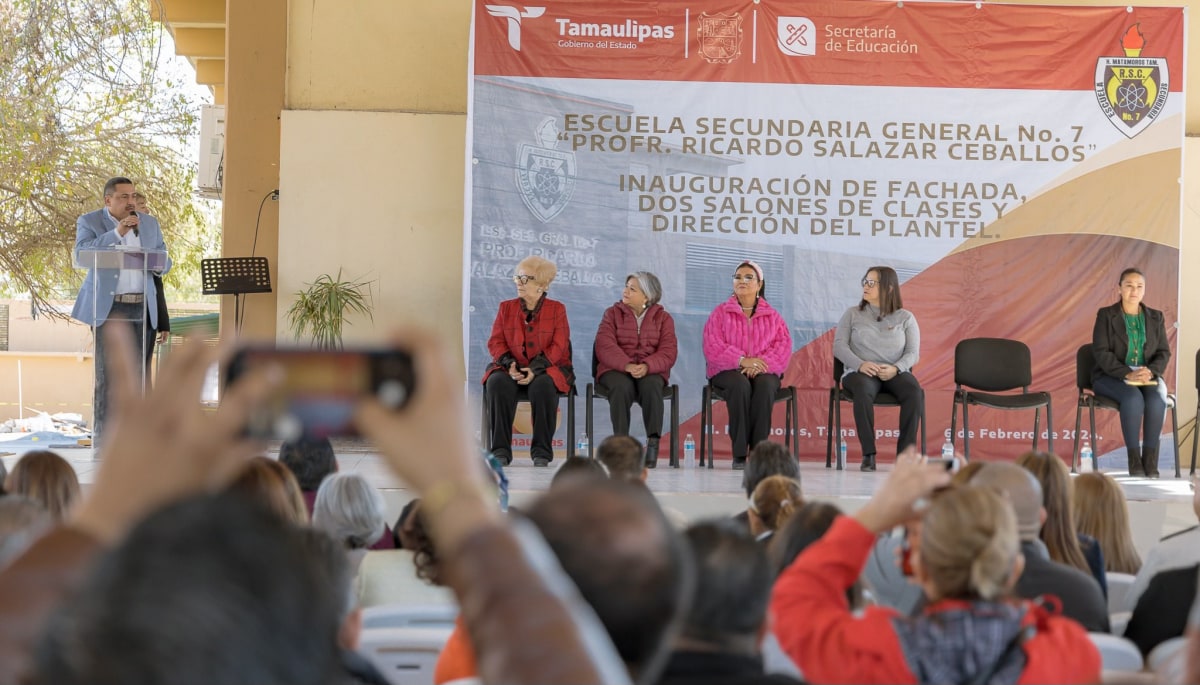 En gira de trabajo por el municipio de Matamoros, la secretaria de Educación de Tamaulipas, visitó la Secundaria General No. 7 “Prof. Ricardo Salazar Ceballos”, donde en compañía de su director, Naif José Hamsho Ibarra, docentes, madres, padres de familias, estudiantes y autoridades municipales, inauguró dos aulas de clases, la dirección administrativa y la fachada del plantel.