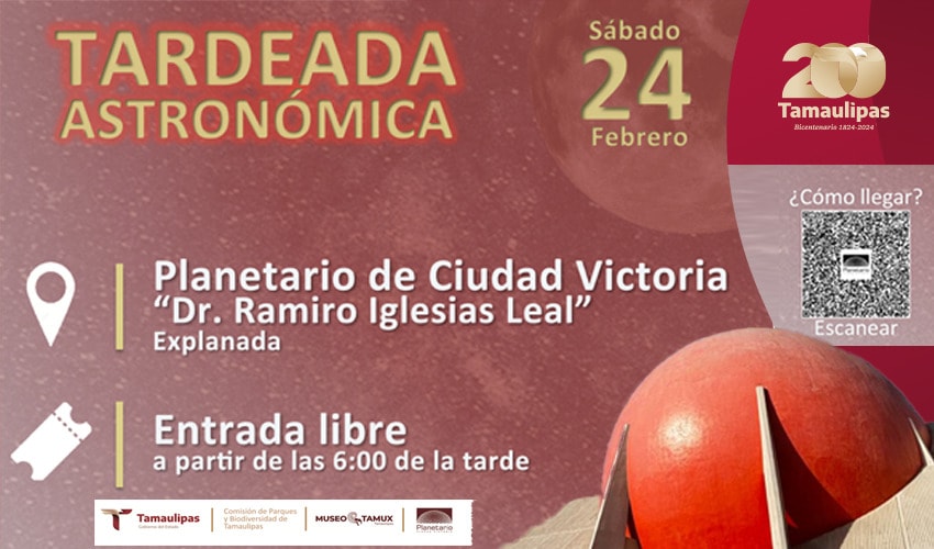 La Secretaría de Educación de Tamaulipas, en coordinación con la Comisión de Parques y Biodiversidad y a través del Museo TAMux hace una atenta invitación a la Tardeada Astronómica, el próximo sábado 24 de febrero, en el Planetario de ciudad Victoria “Dr. Ramiro Iglesias Leal”.