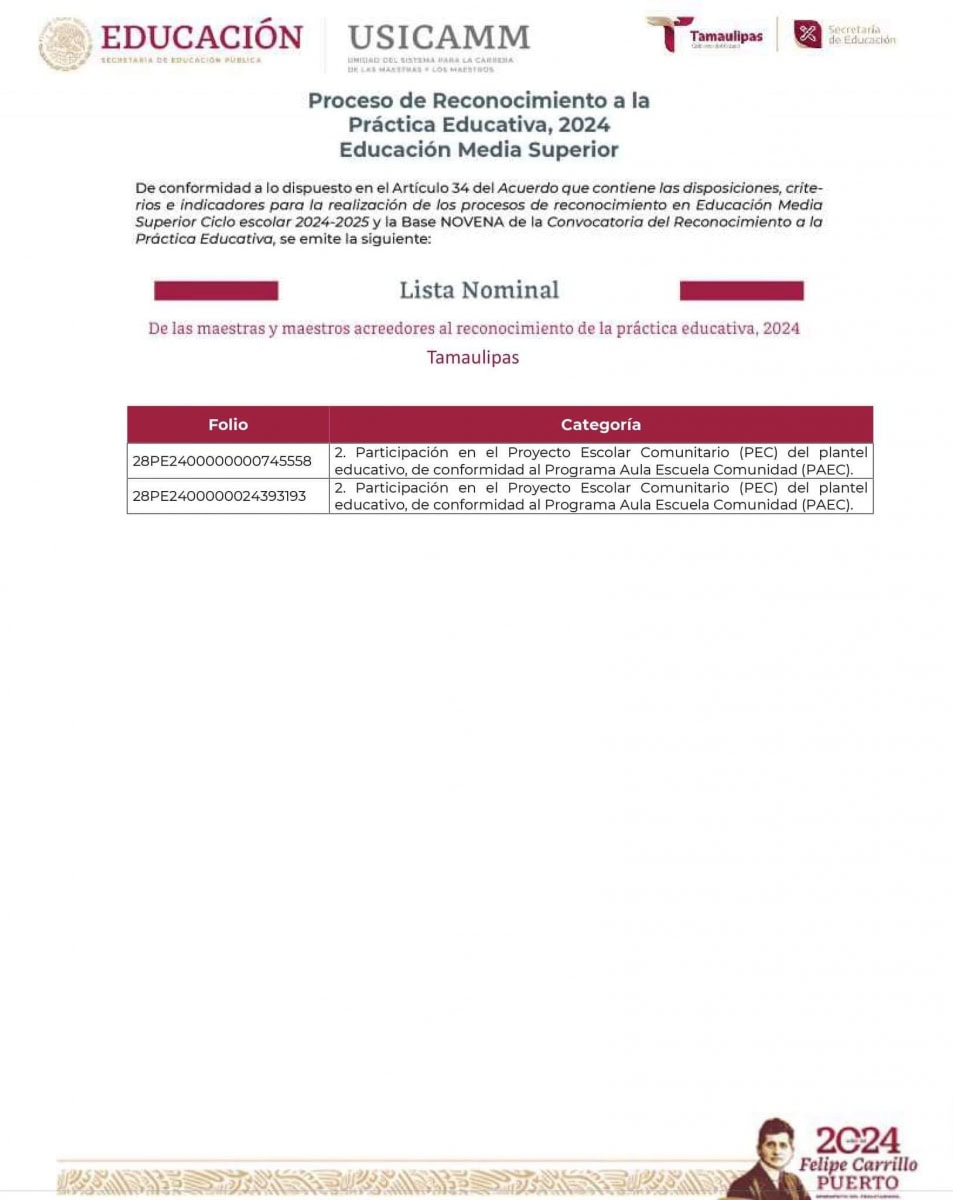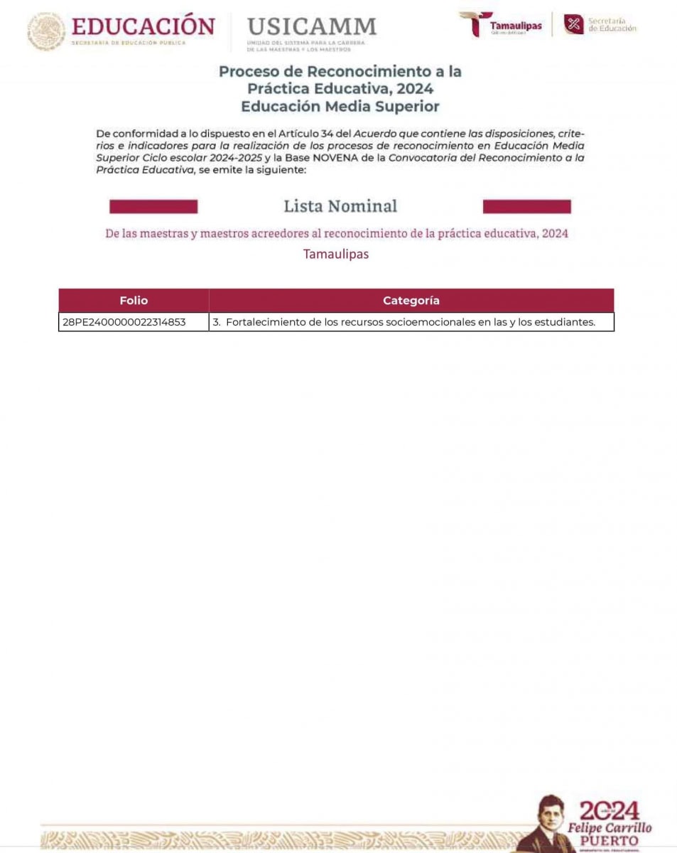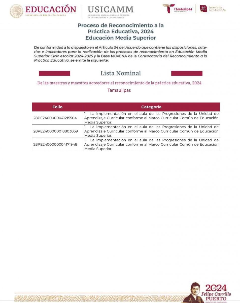 De conformidad a lo dispuesto en el Artículo 34 del Acuerdo que contiene las disposiciones, criterios e indicadores para la realización de los procesos de reconocimiento en Educación Media Superior Ciclo escolar 2024-2025 y la Base NOVENA de la Convocatoria del Reconocimiento a la Práctica Educativa 2024, se emite la siguiente Lista Nominal: