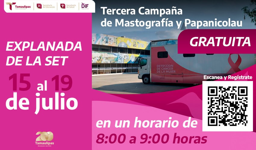 En el marco del Gobierno humanista que conduce Américo Villarreal Anaya, al impulsar programas y acciones que protegen la salud de la comunidad educativa, la Secretaría de Educación de Tamaulipas, invita a la Tercera Campaña de Mastografía y Papanicolaou.