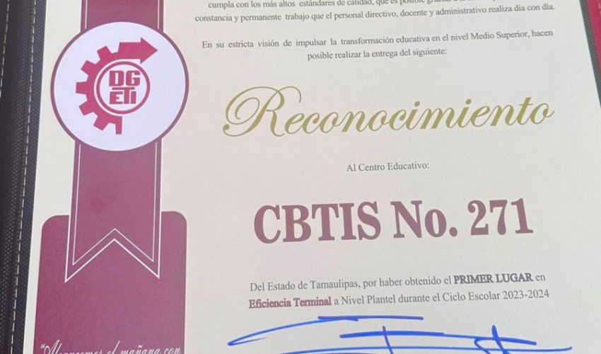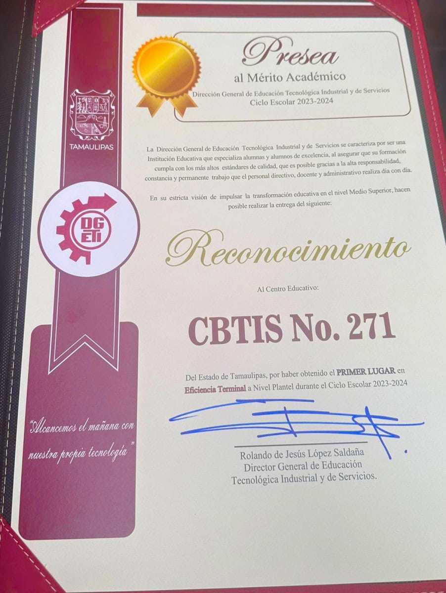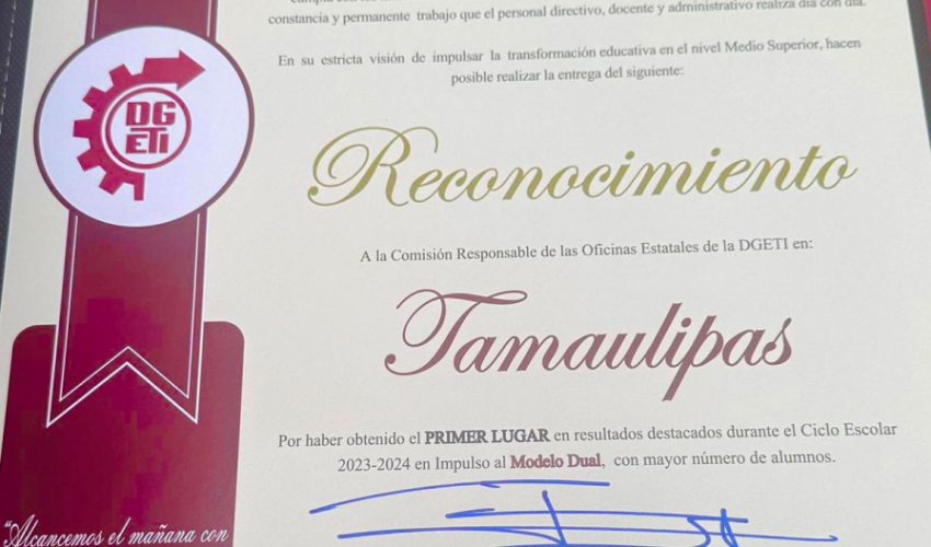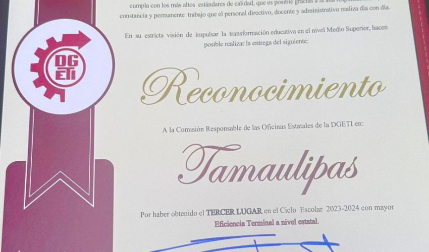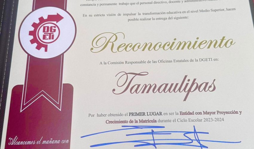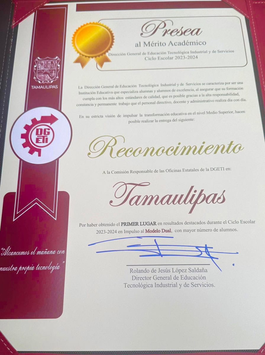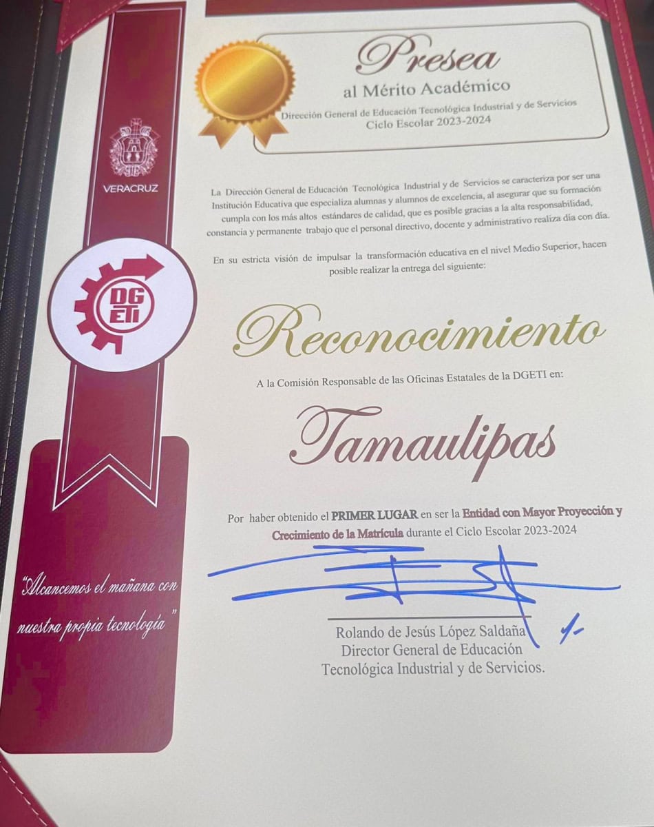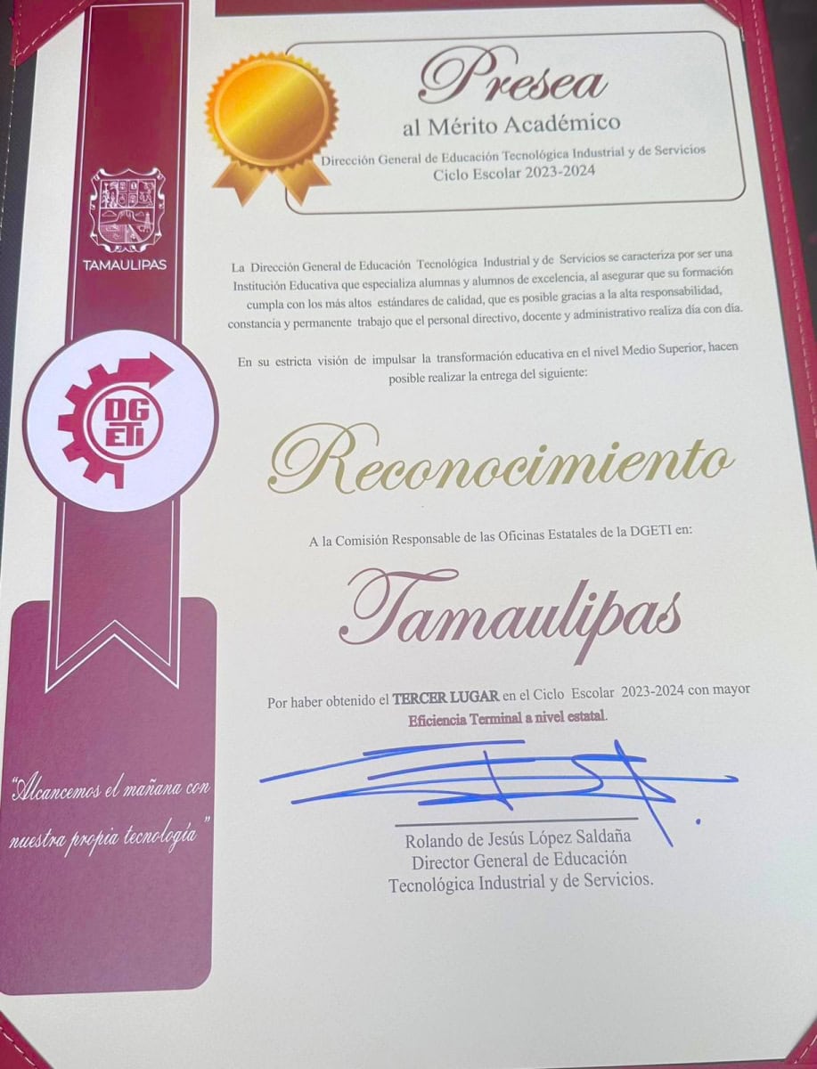 Una merecida felicitación para la Dirección General de Educación Tecnológica Industrial y de Servicios (DGETI) en Tamaulipas, y a su comisionado estatal, Olegario Muñiz Cura, por haber obtenido cuatro reconocimientos a la excelencia académica a nivel nacional.