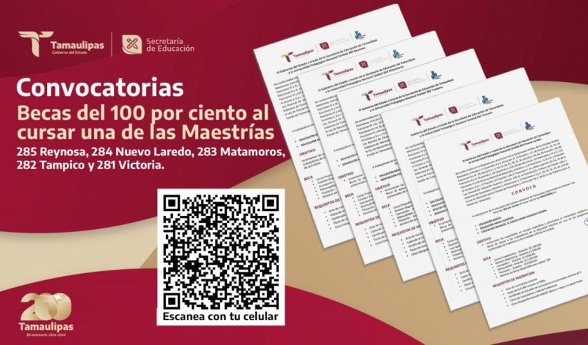 El Gobierno del Estado de Tamaulipas a través de la Secretaría de Educación y la Universidad Pedagógica Nacional en Unidad 281 Victoria, Unidad 282 Tampico, Unidad 283 Matamoros, Unidad 284 Nuevo Laredo y Unidad 285 Reynosa, convoca a trabajadores de la educación del sistema educativo de Tamaulipas interesados en obtener una Beca del 100 por ciento al cursar una de las Maestrías que se ofrecen.