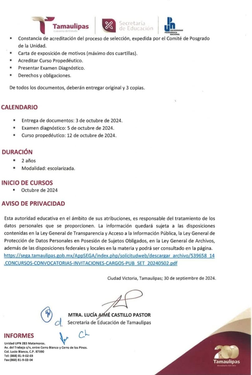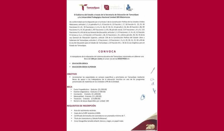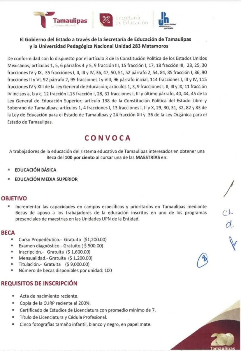 El Gobierno del Estado de Tamaulipas a través de la Secretaría de Educación y la Universidad Pedagógica Nacional Unidad 283 en Matamoros, convoca. 👇🏼