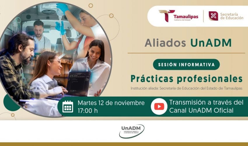 En el marco del Convenio de Colaboración entre la Secretaría de Educación de Tamaulipas (SET) y la Universidad Abierta y a Distancia de México (UnADM), invitan a conocer las alianzas que hay, para que puedas realizar tus prácticas profesionales y proyectos terminales, a través de la sesión virtual «Aliados UnADM».
