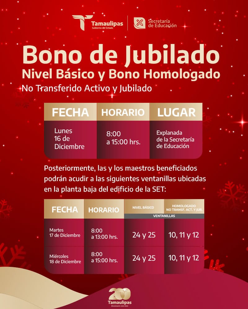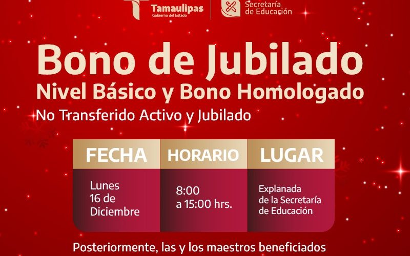 Los pagos del Bono de Jubilado Nivel Básico y Bono Homologado No Transferido Activo y Jubilado, se realizarán el lunes 16, martes 17 y miércoles 18 de diciembre, en las instalaciones de la Secretaría de Educación de Tamaulipas, ubicada en calzada Gral. Luis Caballero, Fracc. Las Flores, en Ciudad Victoria.