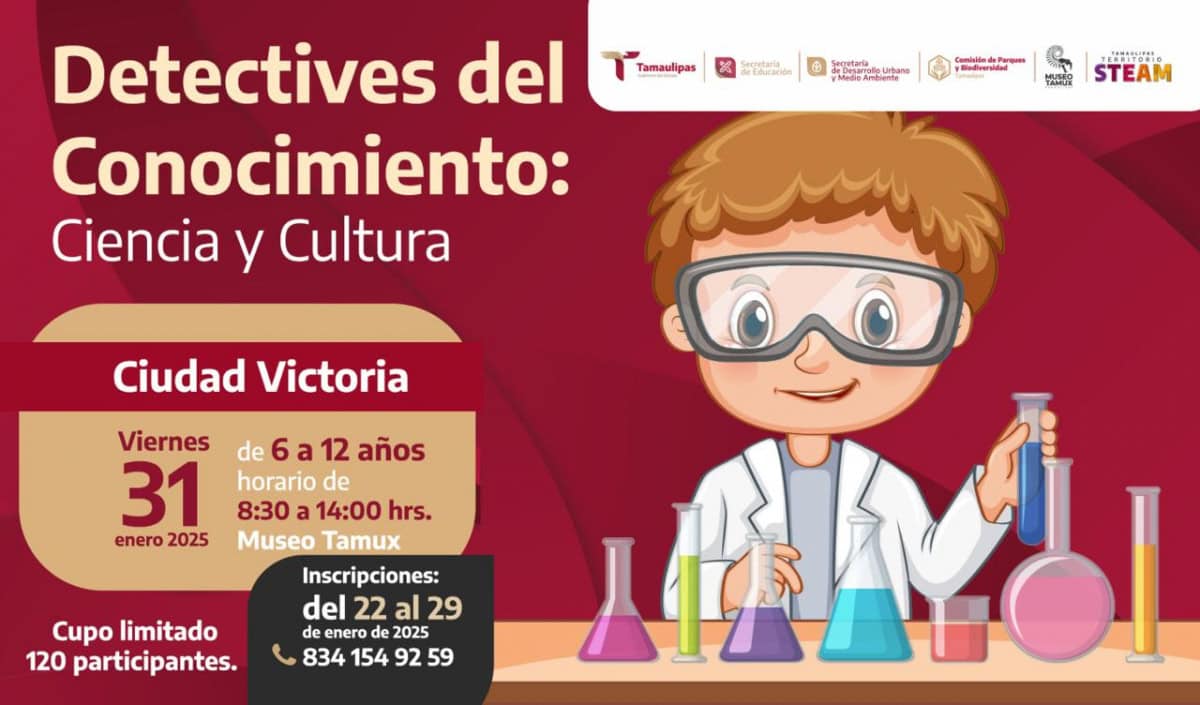 La Secretaría de Educación de Tamaulipas invita a niñas y niños de 6 a 12 años a participar en “Detectives del Conocimiento: Ciencia y Cultura” que se realizará el próximo viernes 31 de enero (de Consejo Técnico Escolar), en el Museo Tamux, en Ciudad Victoria.