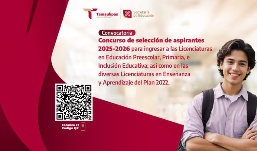 El Gobierno del Estado de Tamaulipas a través de la Secretaría de Educación, convoca al Concurso de Selección de Aspirantes 2025-2026 para ingresar a las Licenciaturas en Educación Preescolar, Primaria, e Inclusión Educativa; así como en las diversas Licenciaturas en Enseñanza y Aprendizaje del Plan 2022, en Instituciones Públicas y Particulares Formadoras de Docentes de Educación Básica de Tamaulipas.