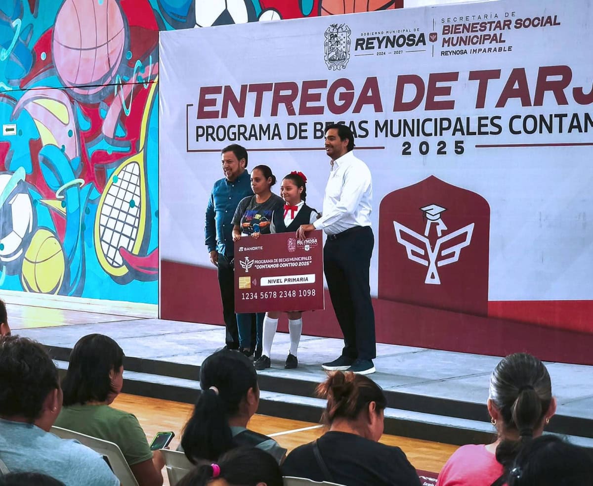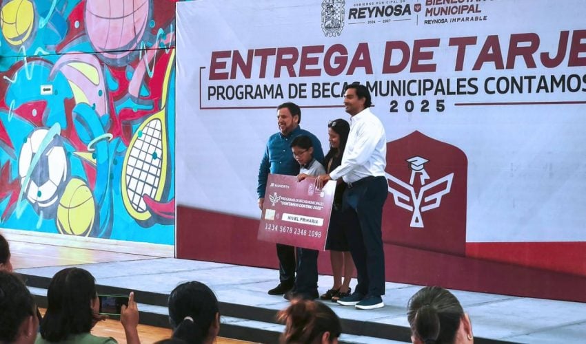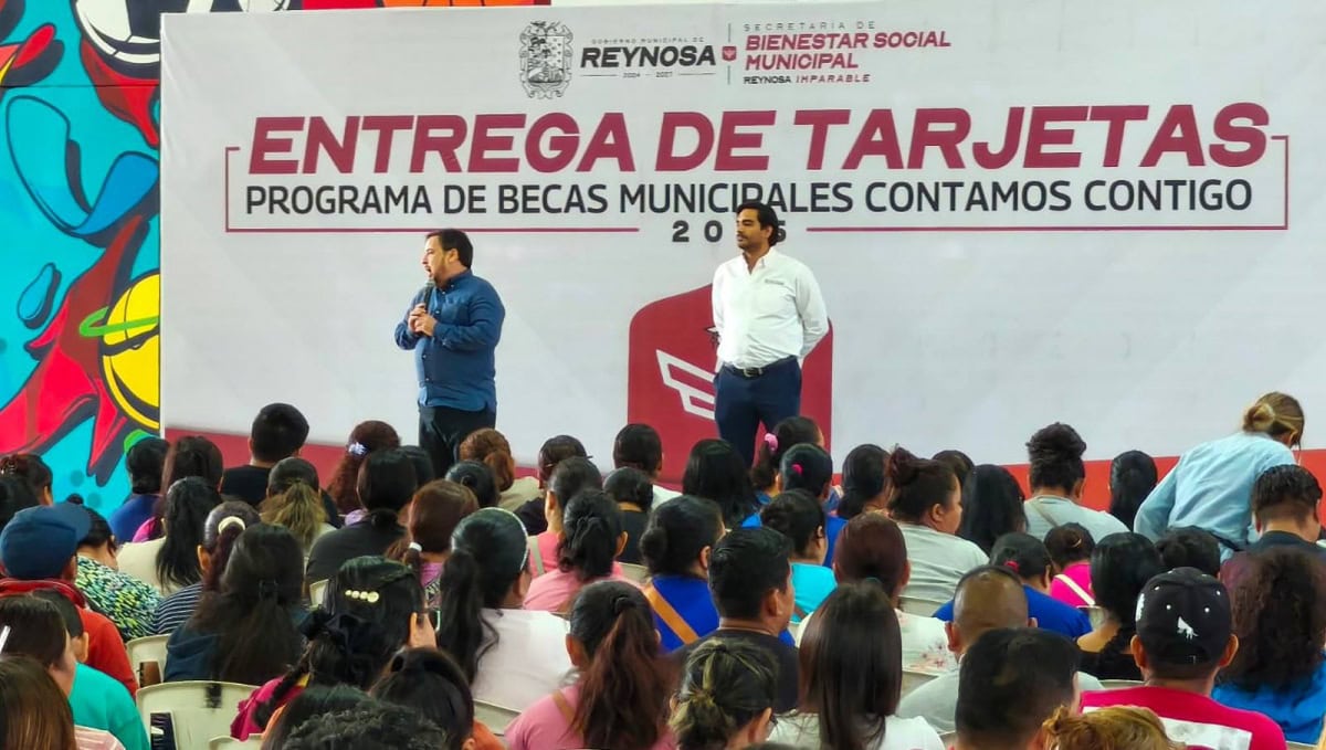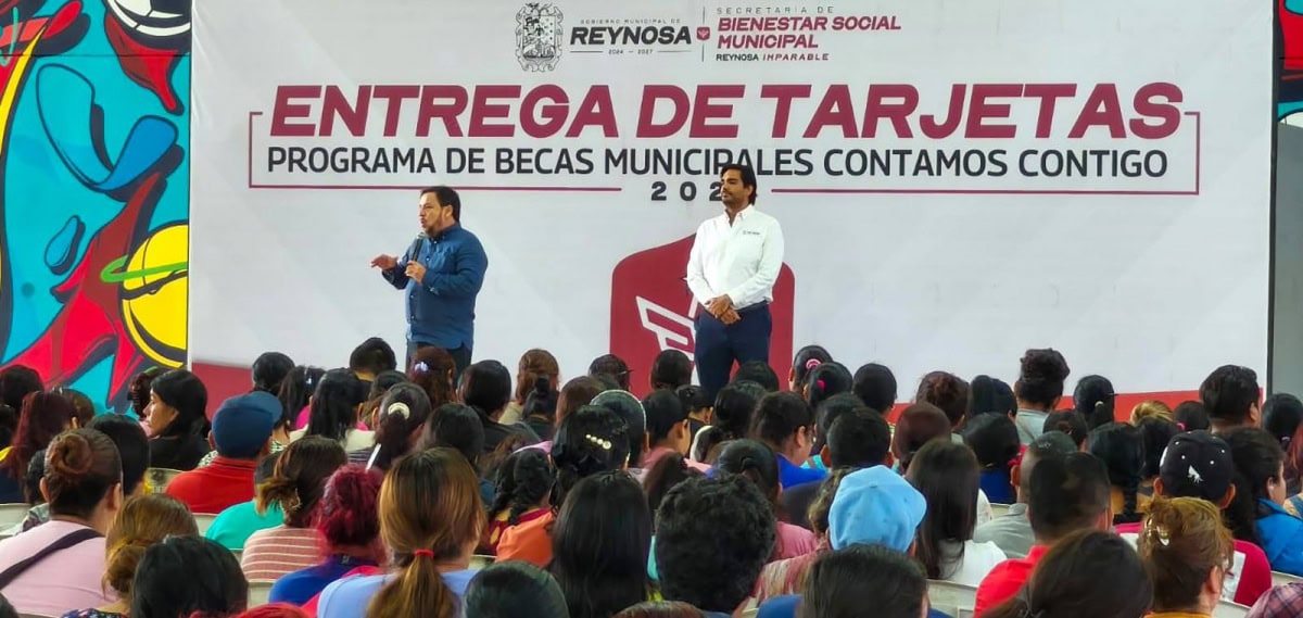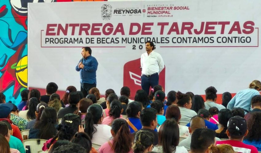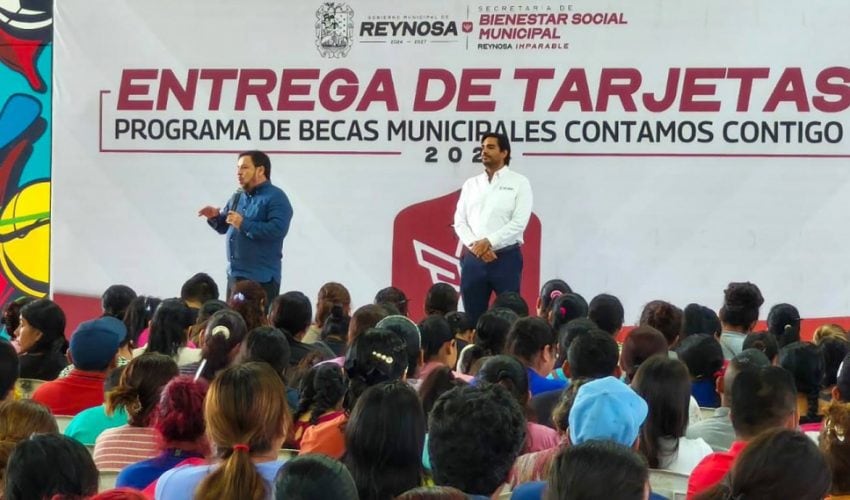 Entrega de tarjetas del programa de becas municipales, en Reynosa