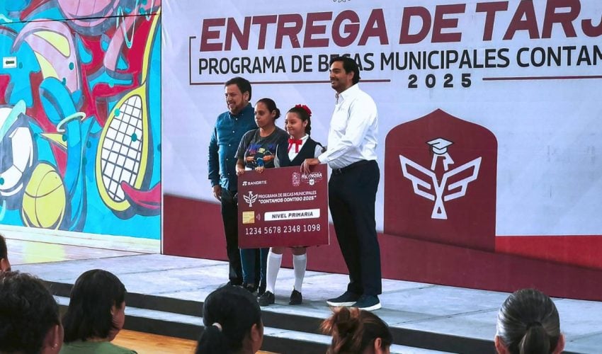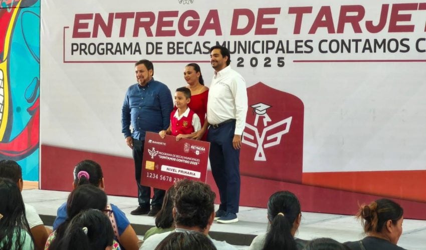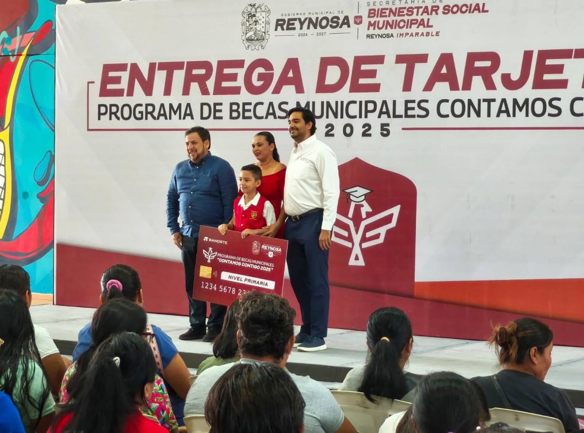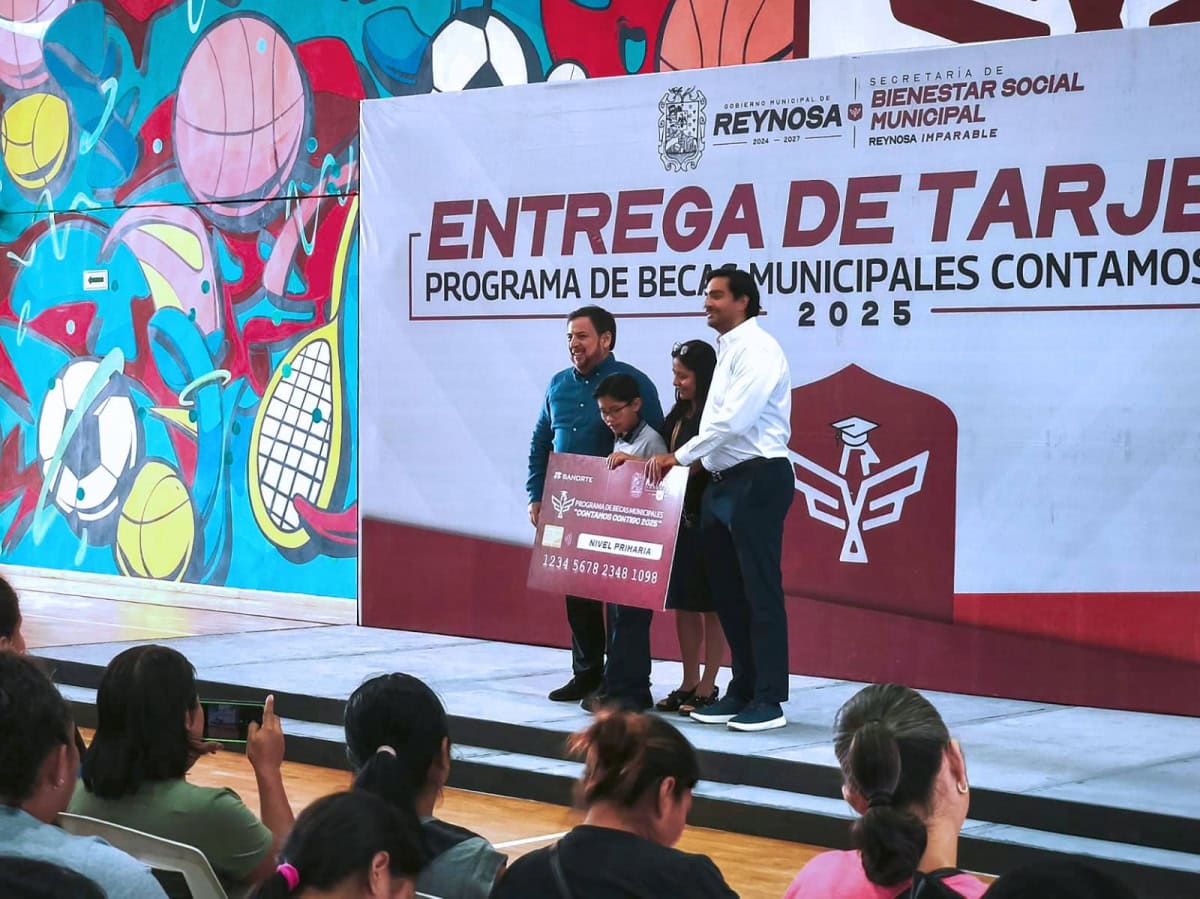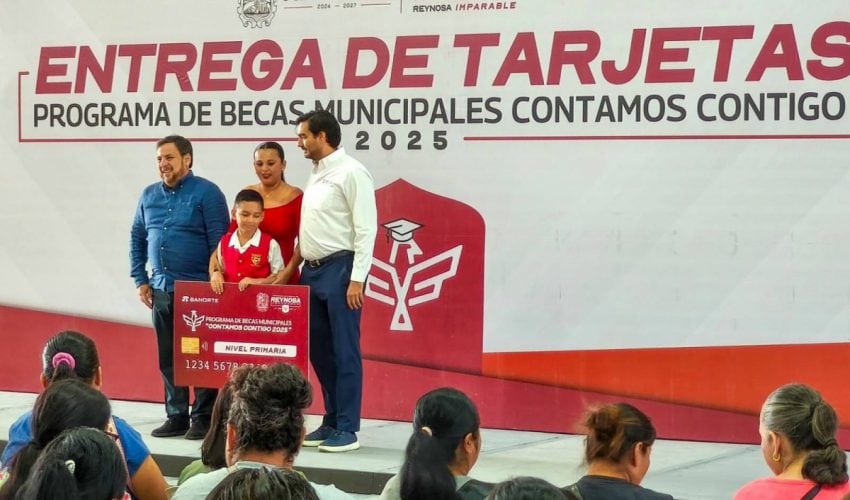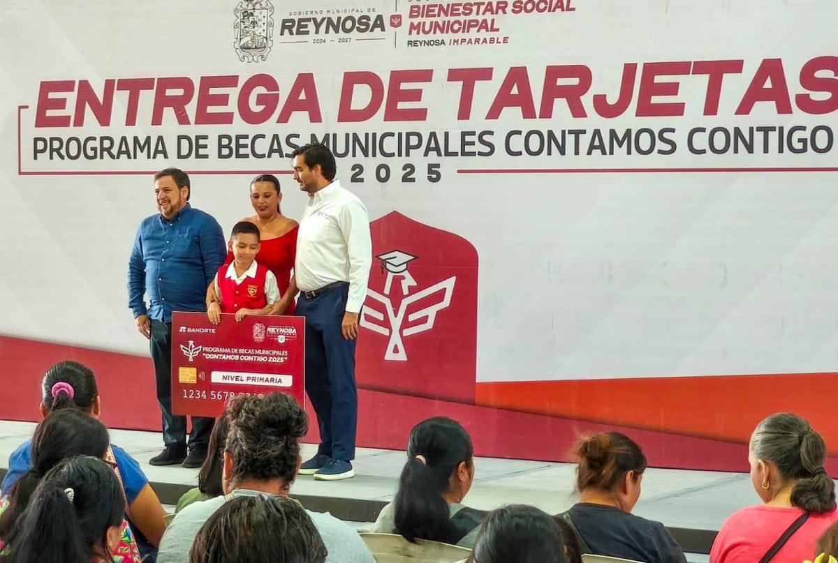 Entrega de tarjetas del programa de becas municipales, en Reynosa