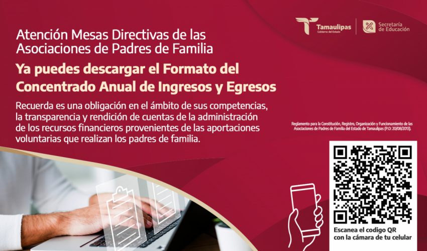 Cumpliendo la normatividad vigente, y con el objetivo de fomentar la corresponsabilidad de las madres y los padres de familia al proceso educativo, la Secretaría de Educación de Tamaulipas, a través de la Unidad Ejecutiva, y por conducto de la Dirección de Participación Social, invita a las Mesas Directivas de las Asociaciones de Padres de Familia, a que descarguen el “Formato de Concentrado Anual de Ingresos y Egresos”, en el siguiente link👇🏼